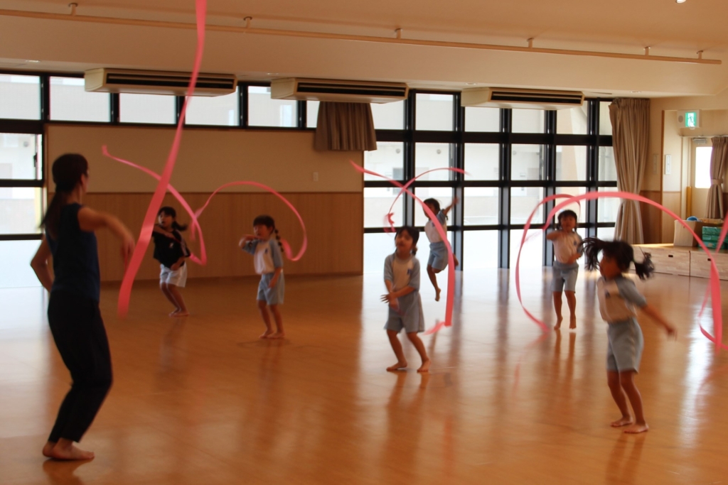 年中・年長児を対象にリボンやボール、フープなどを使用した演技の練習をしています。