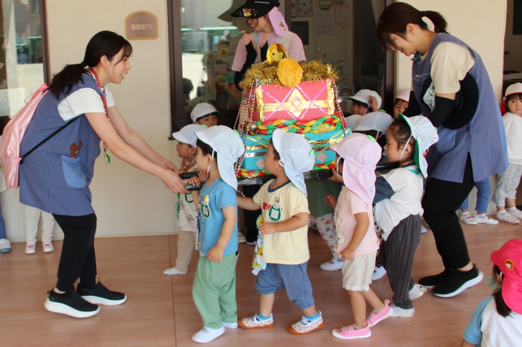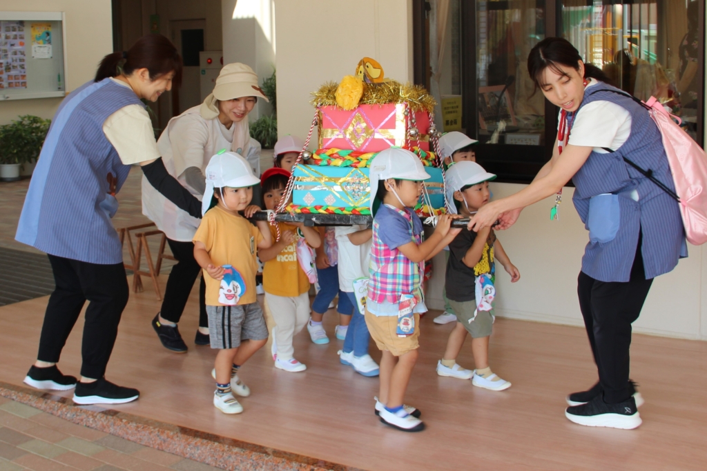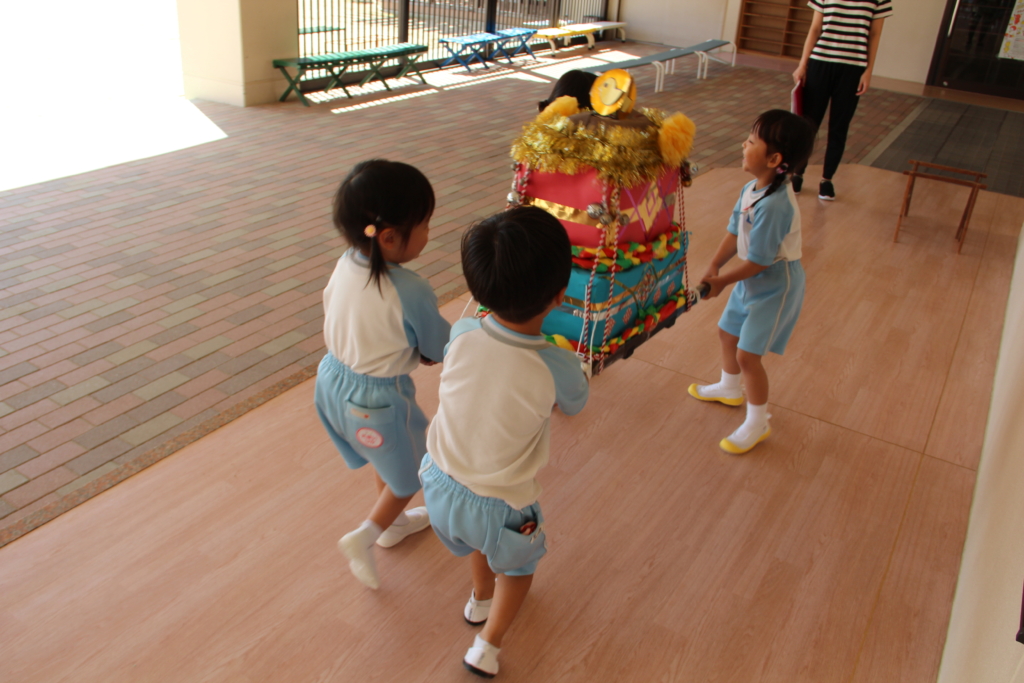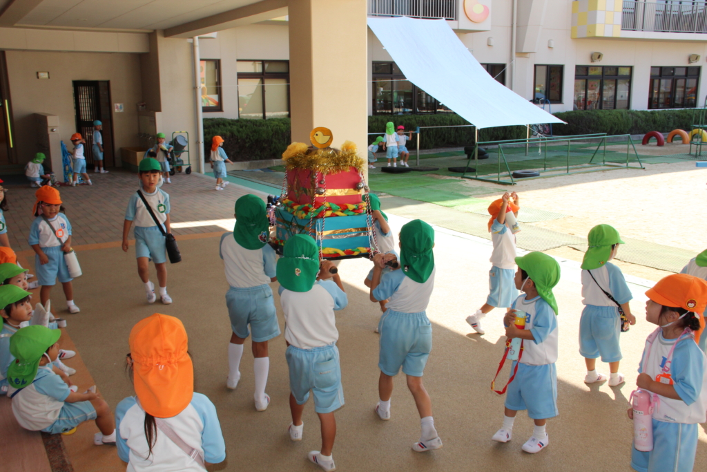 お神輿を担ぐのは、きっと初めての体験のお友だちばかりだったと思います。たぶん、何のことかわからずに担いでいたことでしょう😎