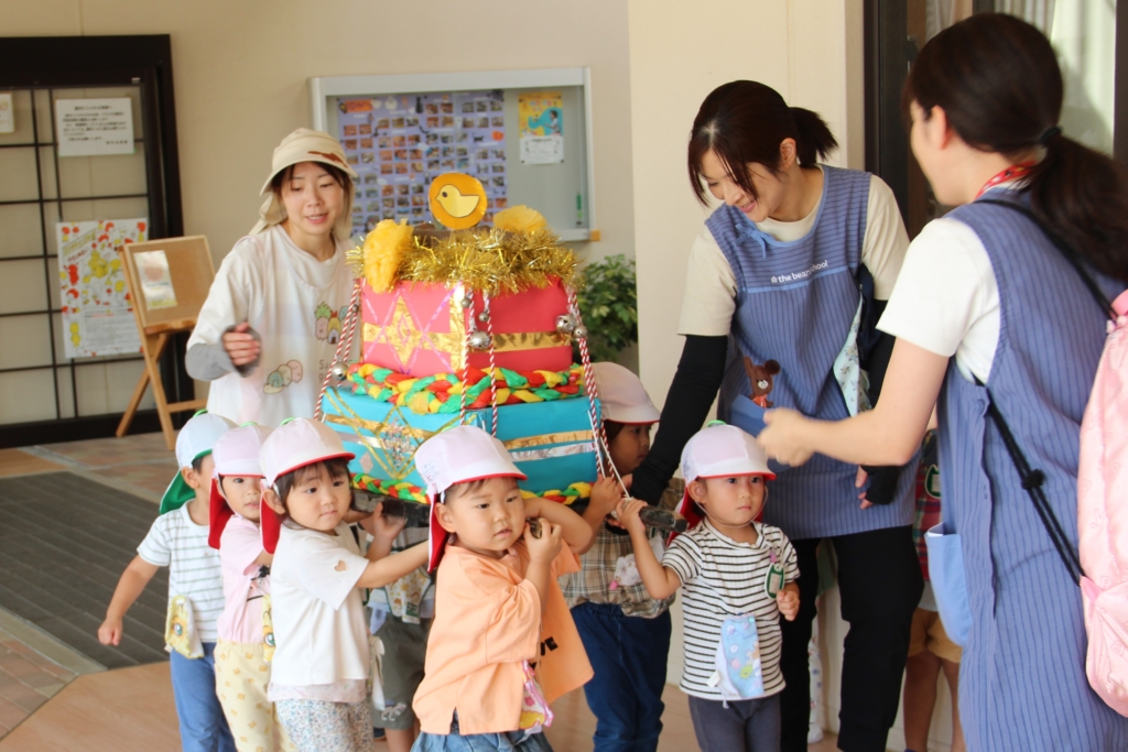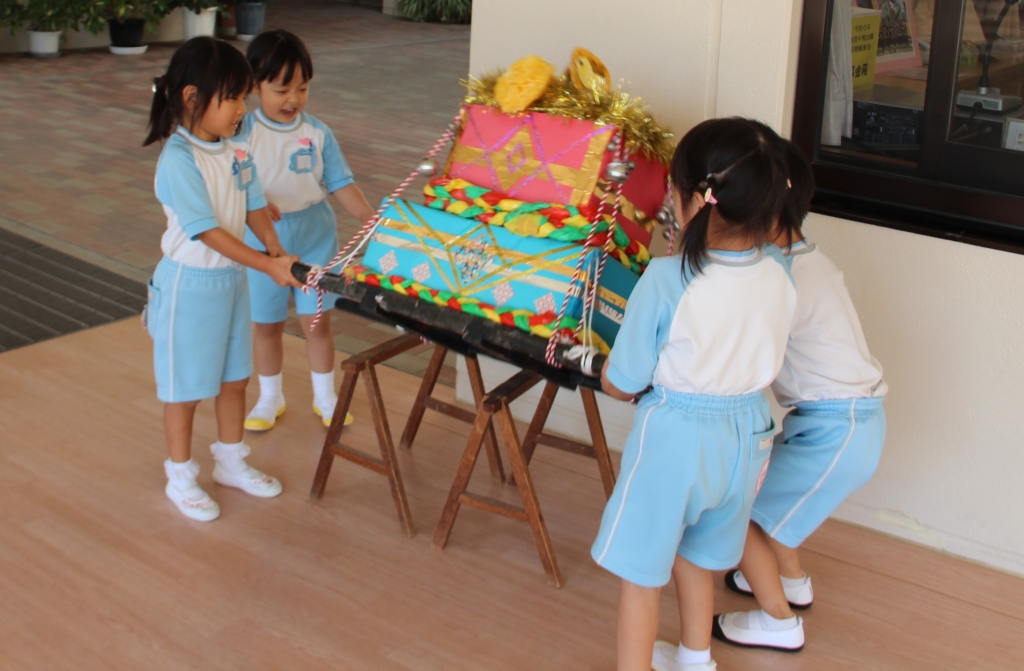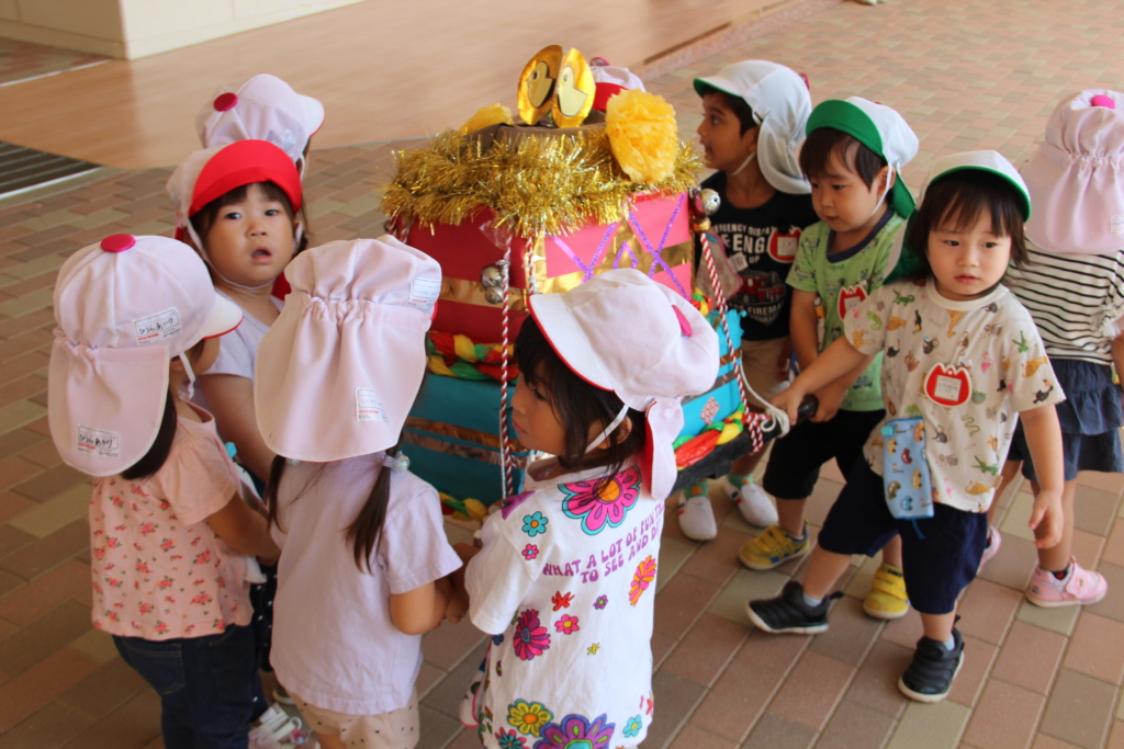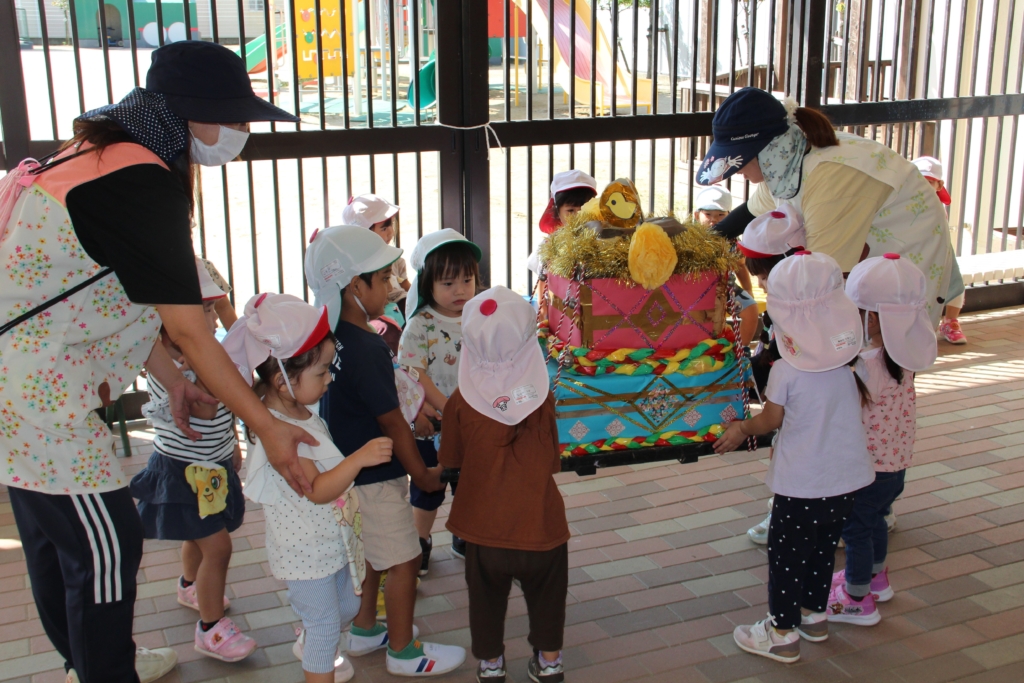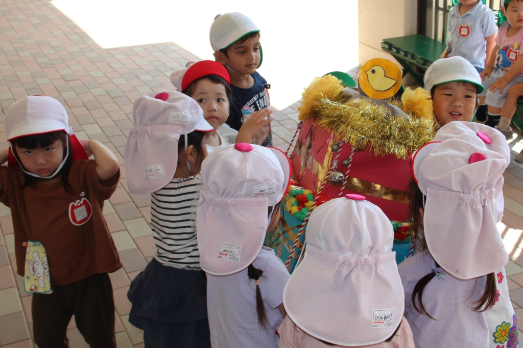 お神輿を担ぐのは、きっと初めての体験のお友だちばかりだったと思います。たぶん、何のことかわからずに担いでいたことでしょう😎