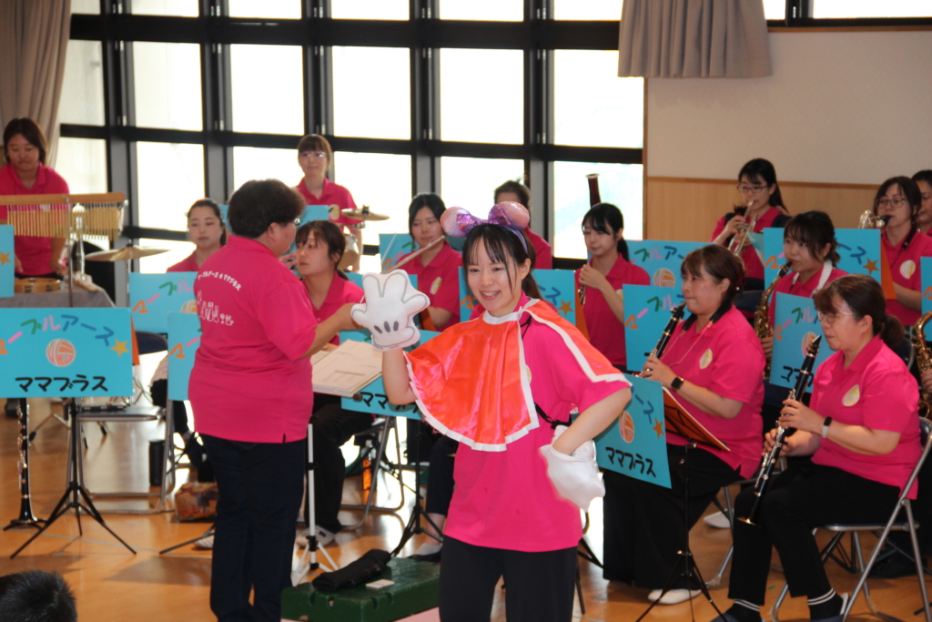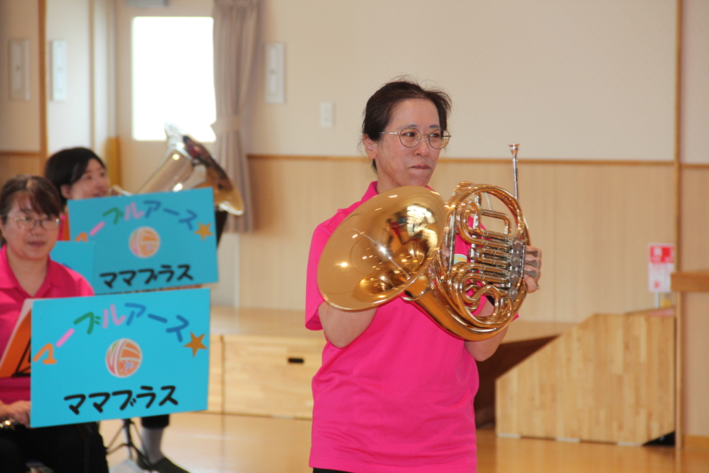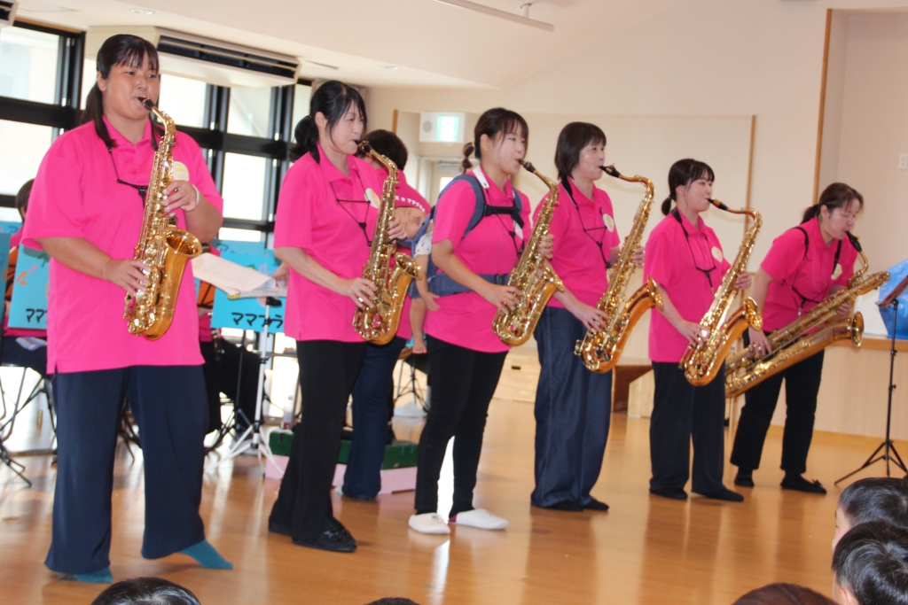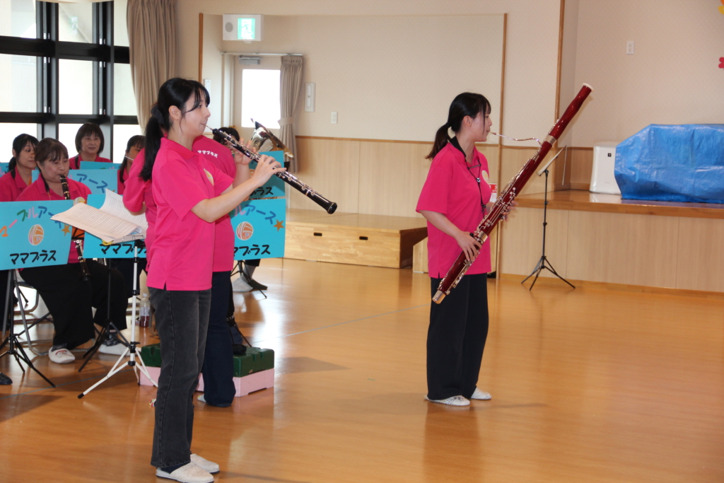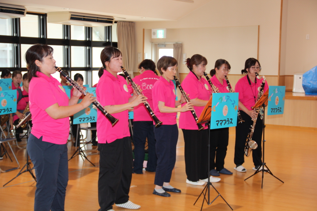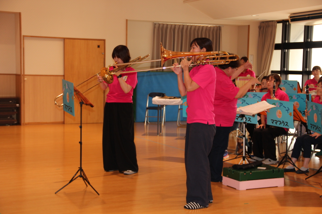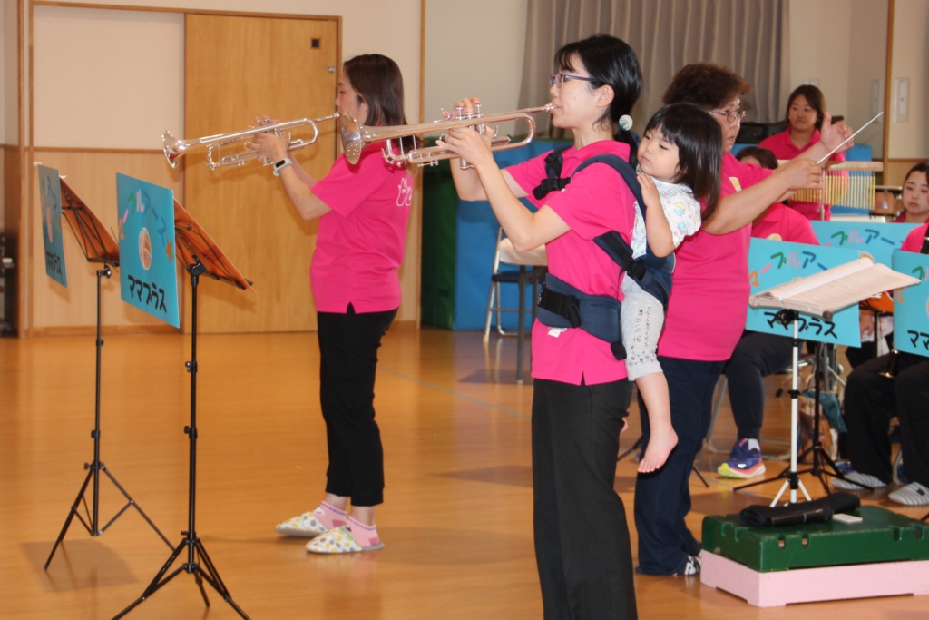 写真を見てわかるように、ママさんブラスバンドなので、お子さんを背中に背負って演奏しなければならないこともあります。練習も本番も本当に大変だと思います。これからも、いろいろな所で、すてきな音を響かせていただきたいと思います。