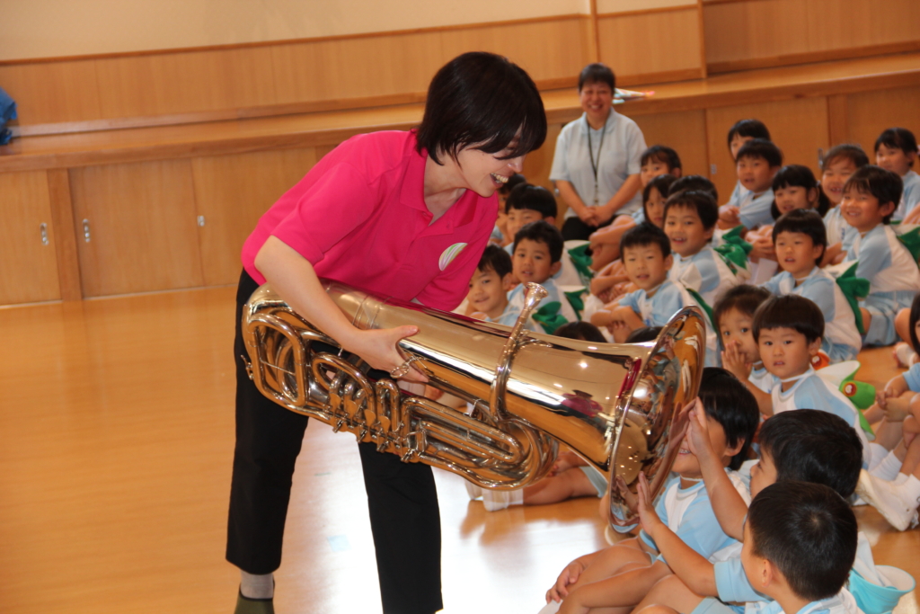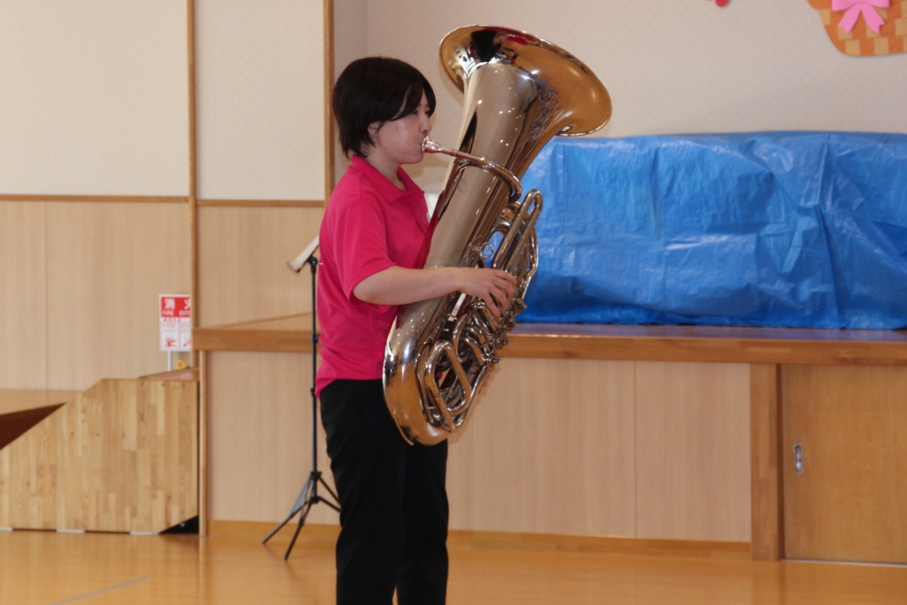 昨日の10月9日、お誕生会のゲストで、ママさんブラスバンドの「マーブルアース」さんが来てくださいましたので、せっかくの機会ですから、楽器名あてクイズを・・・