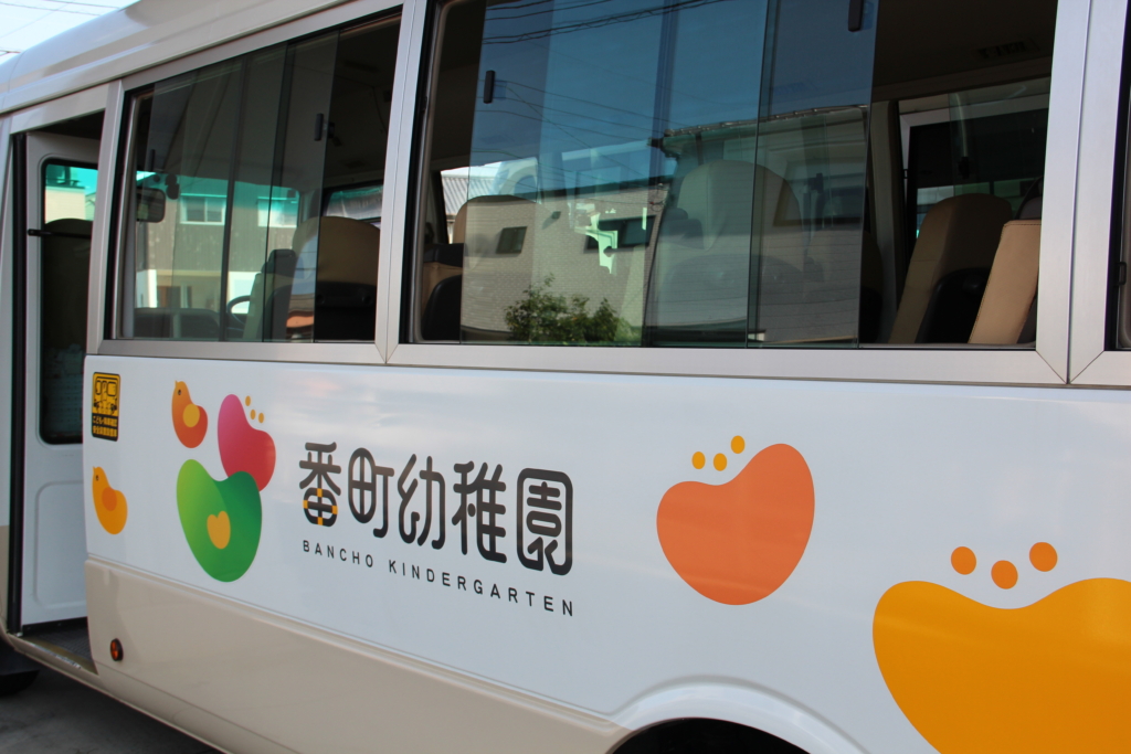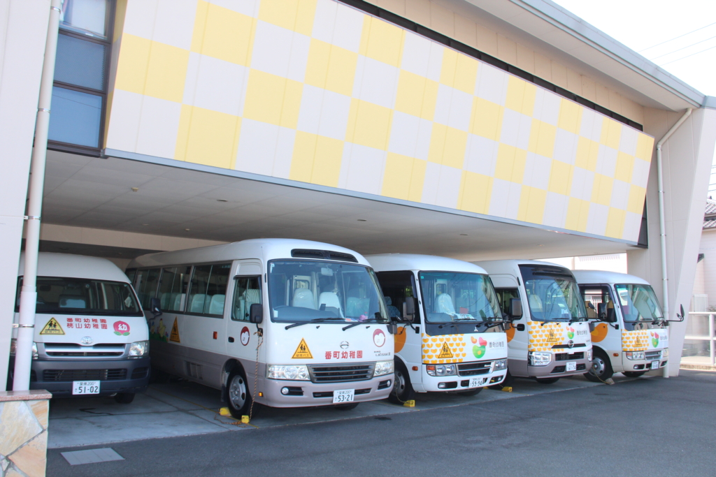 番町幼稚園では、5台のバスが全部で15コースを通って、およそ200人のお友だちを幼稚園に運んでいます。