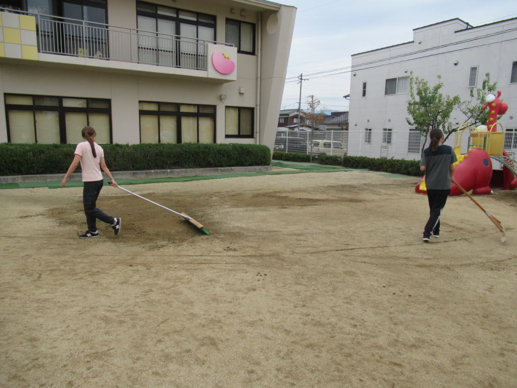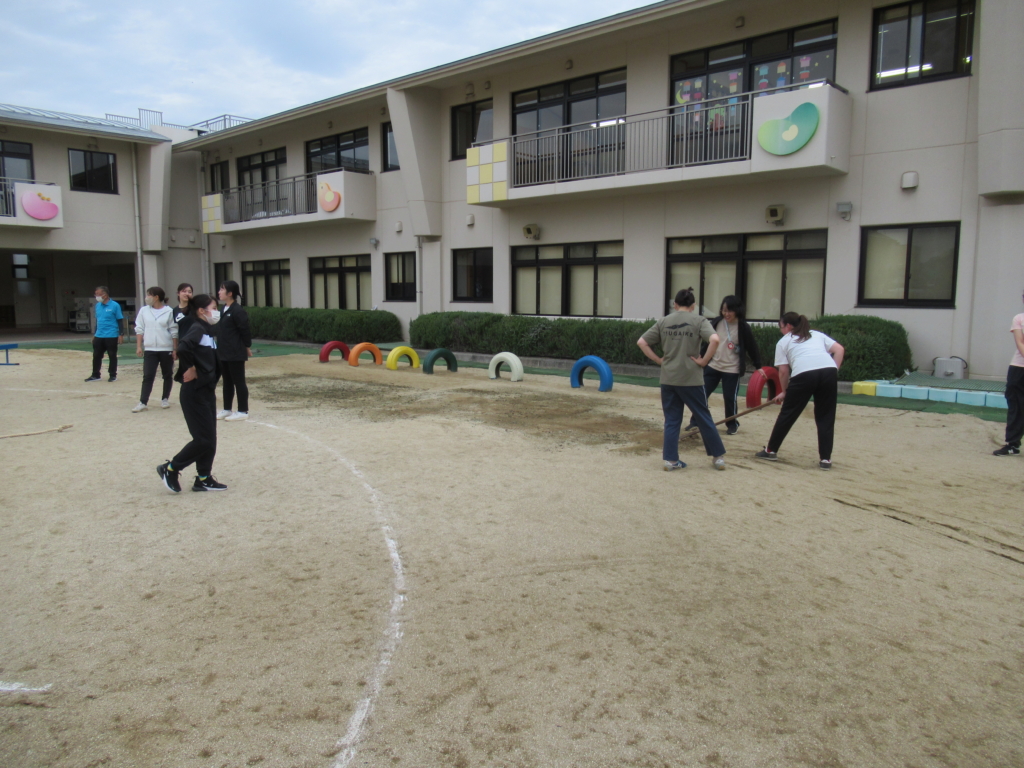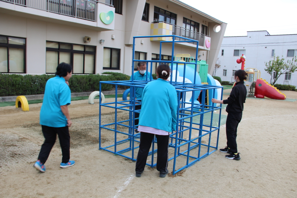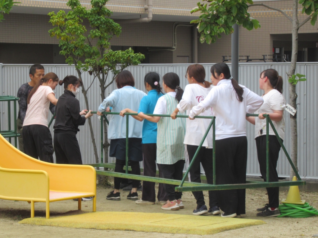 先生たちみんなが協力して、遊具の大移動をしているところです