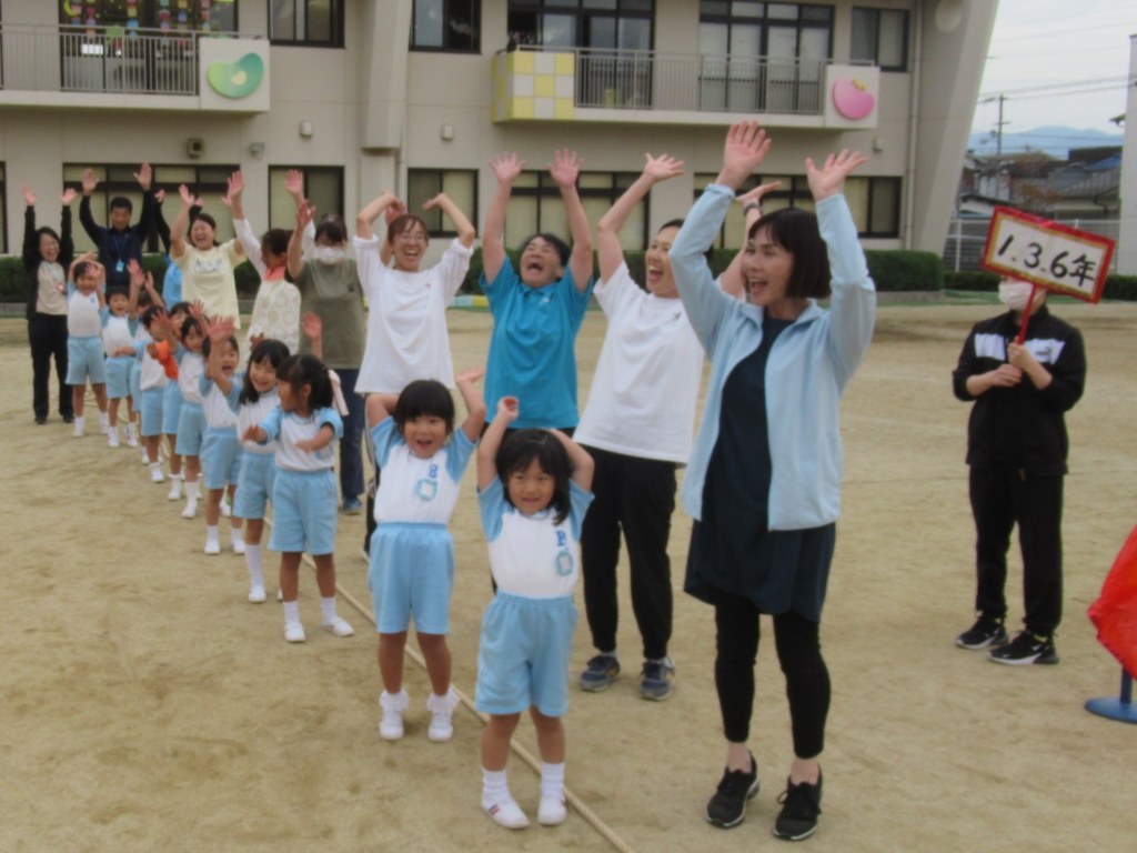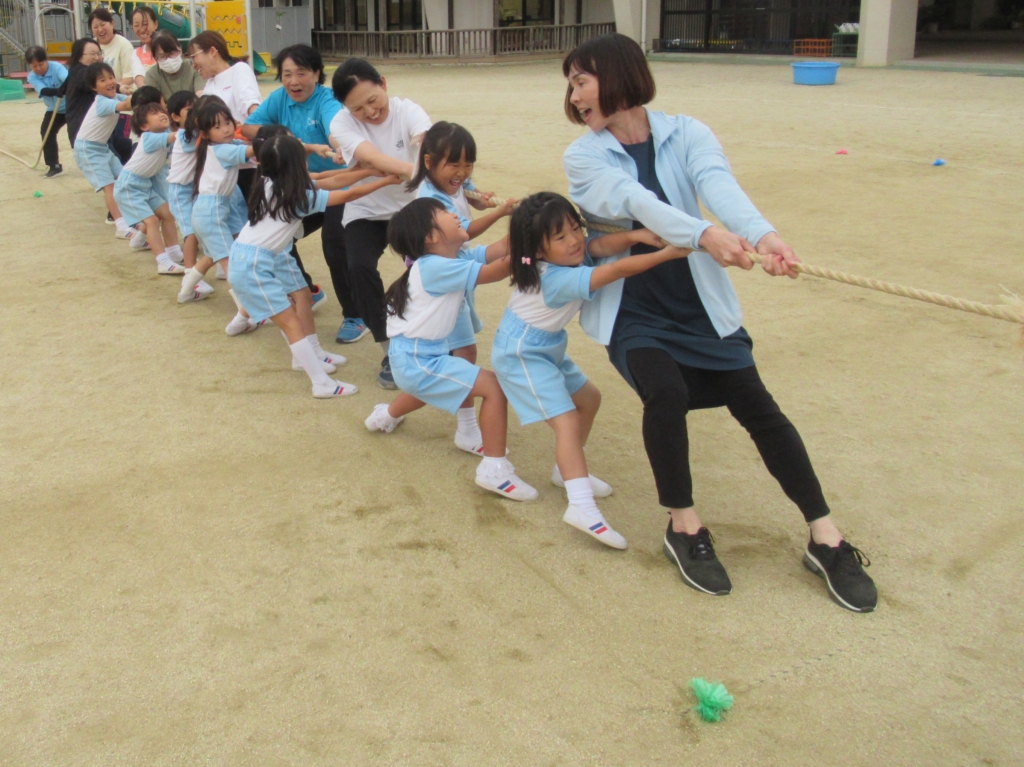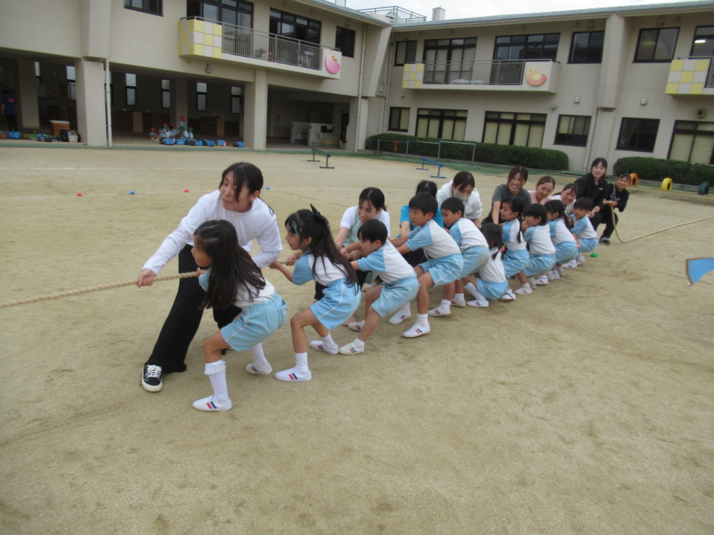 21日、遊具を移動させた後、大きな勝負がありました。預かりの子も呼んできて、「昭和生まれの先生チーム」対「平成生まれの先生チーム」の綱引き大決戦が行われたのです!