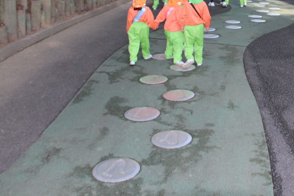 子どもたちは、全部踏んで行きたかったけど、二人組で並んで歩いていたので、踏んで行くことはできませんでした。🦵