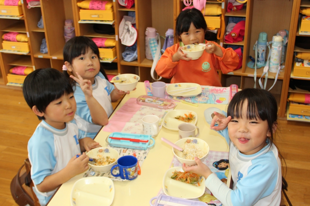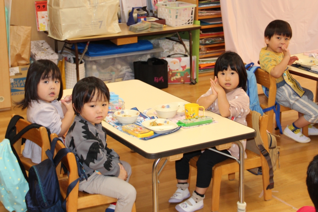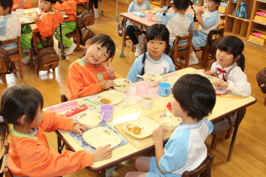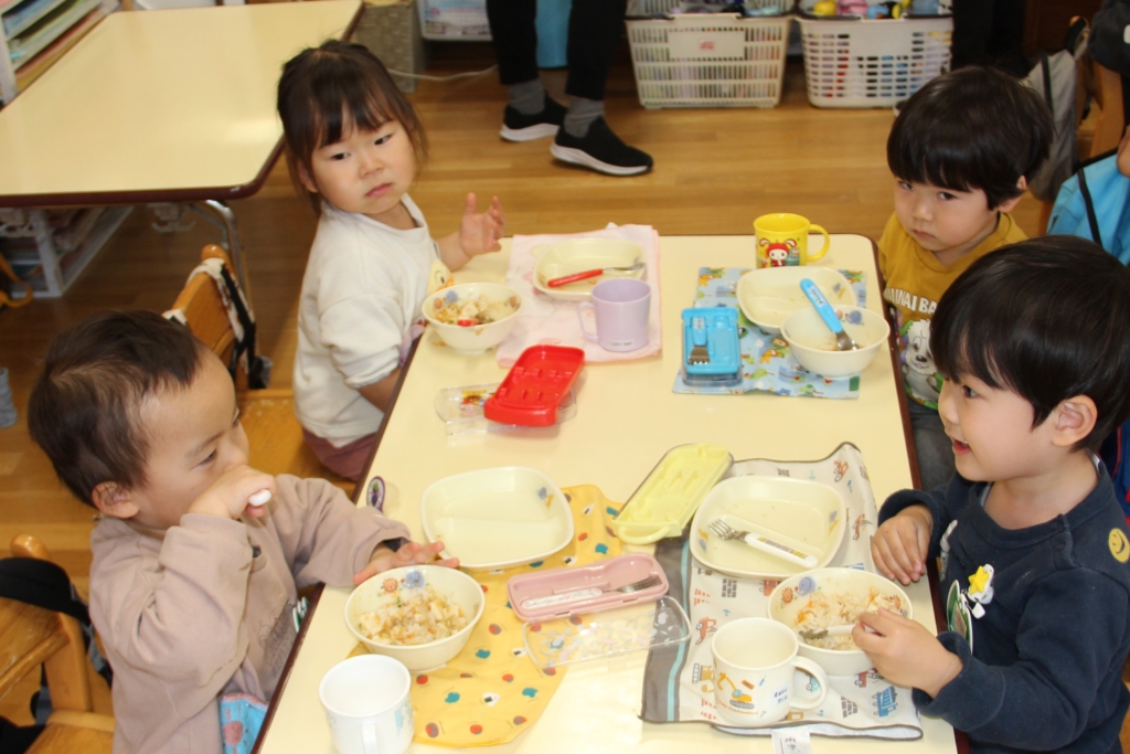 いちご組🍓さんも、めろん組🍈さんも、落ち着いて座って給食を食べていました🙂