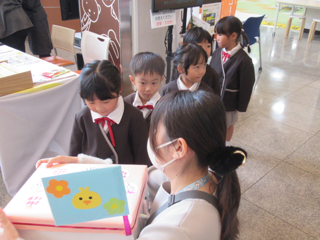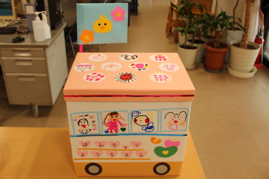 今まで、番町幼稚園で集めてきた募金を、特性バス型貯金箱に入れて日本赤十字社の代表の方や、愛媛県共同募金会の代表の方に手渡しで、贈呈させていただきました。