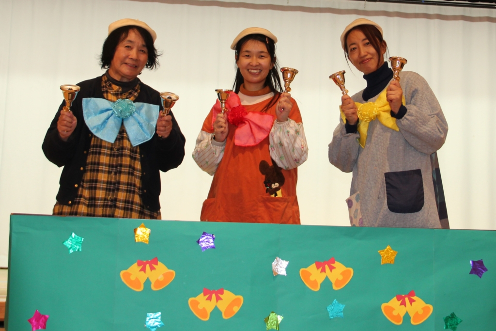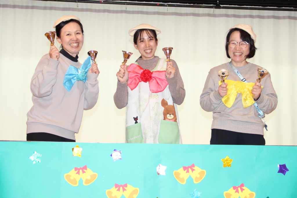 そして、最後に、白ちゅうりっぷ組と年少組の先生が、ハンドベルで「ハッピーバースデー」と「ひいらぎかざろう」の2曲を演奏してくれました。