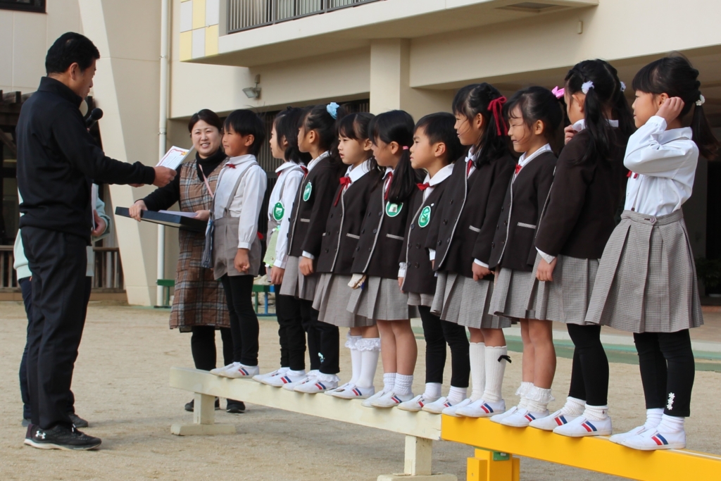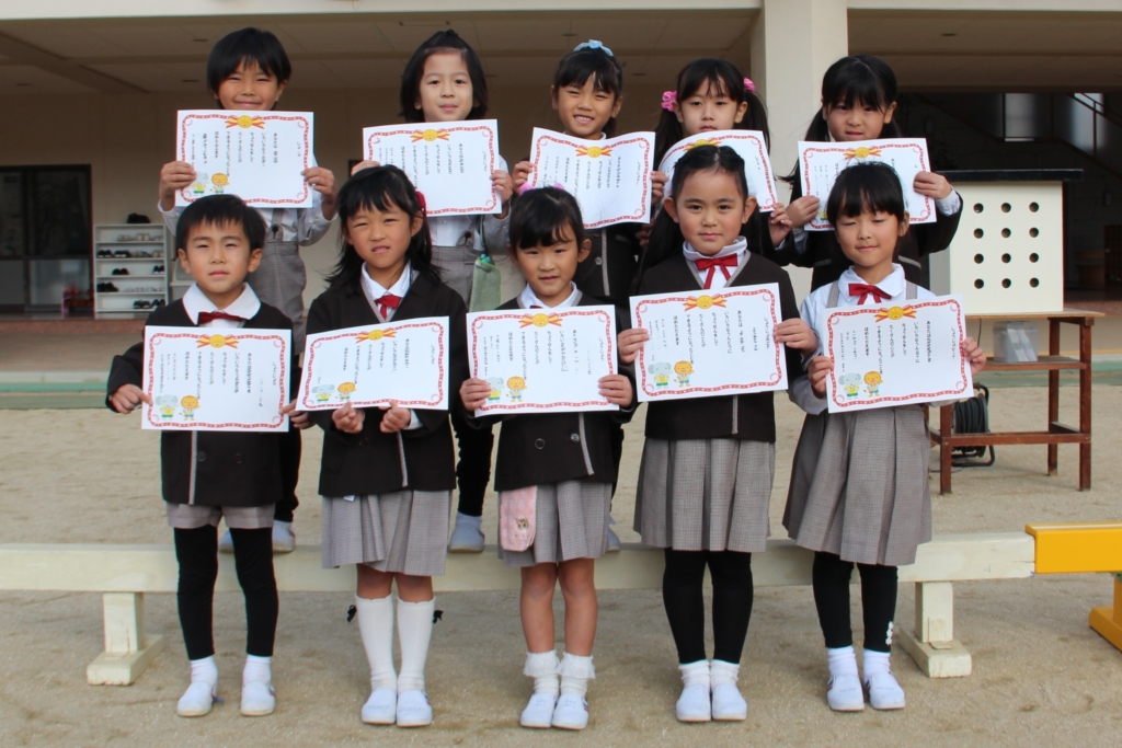 12月17日、今日は年長組さんの中で、2学期、体育を特に頑張ったお友だちの表彰式がありました。1学期の表彰者は、たったの1人でしたが、2学期はなんと11人もいました。