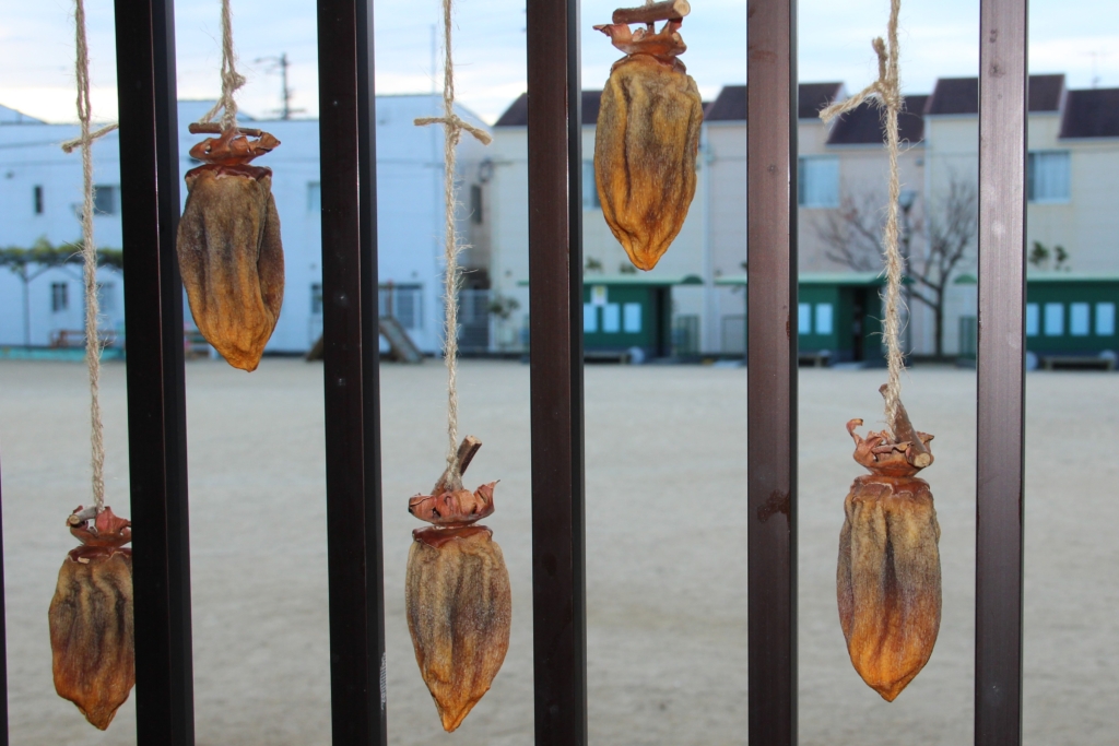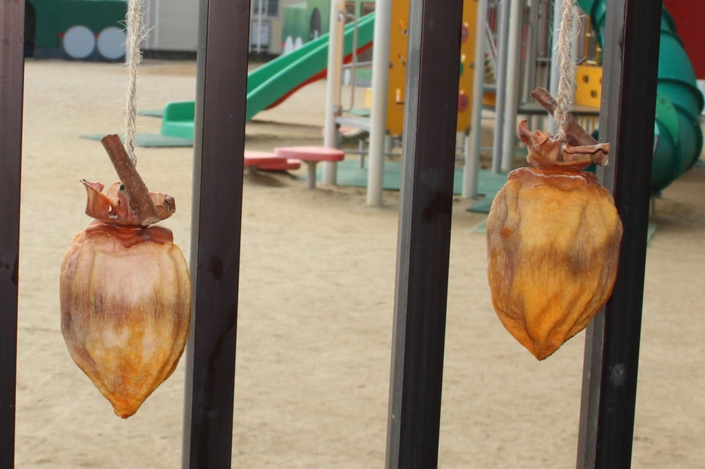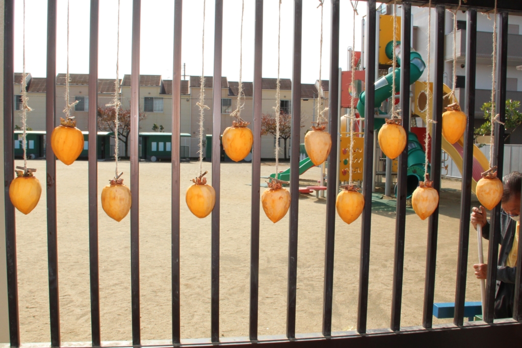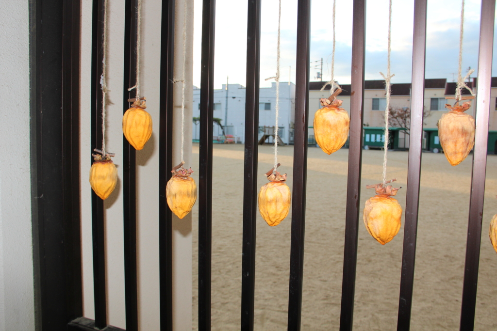 幼稚園の玄関をくぐった目の前の所に干された柿たち・・・