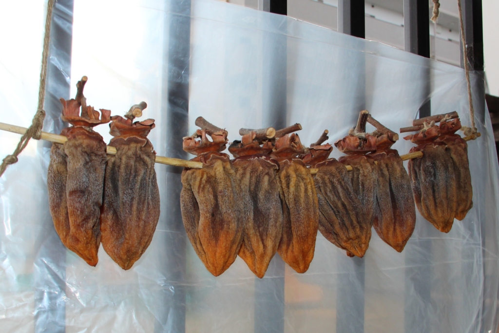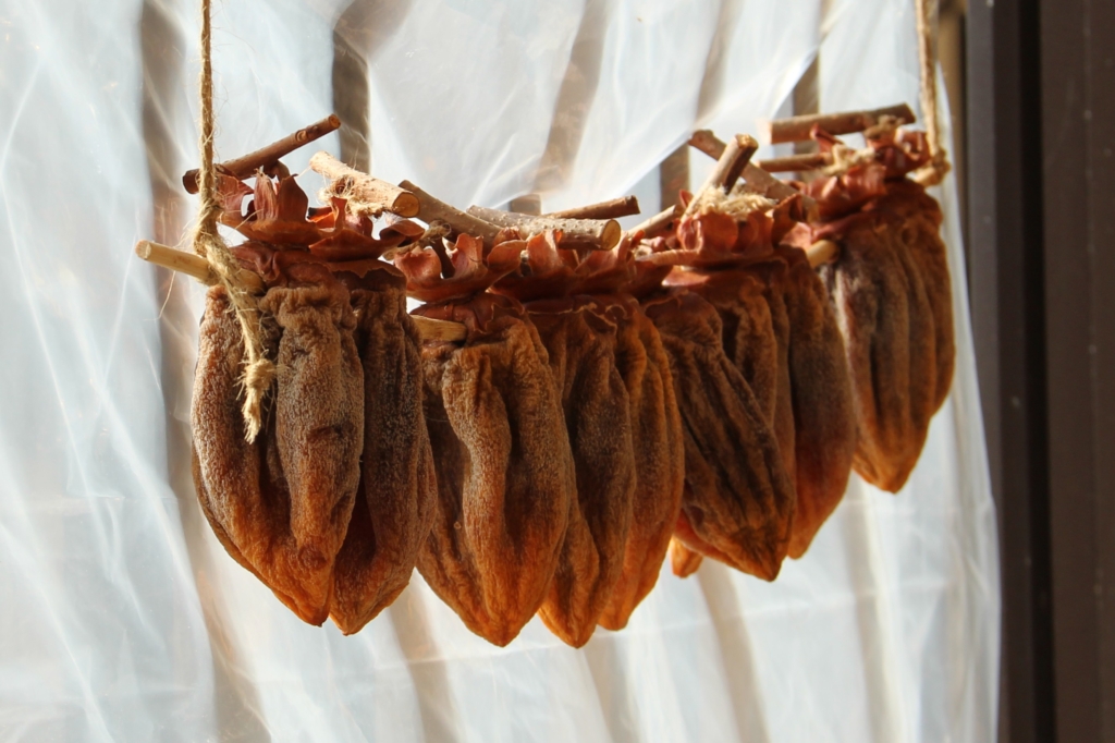 干し柿は、冬の保存食で、日本、朝鮮半島、中国大陸、台湾、ベトナムで作られているそうです。高カロリーで、食物繊維やβカロチンが豊富だそうです。