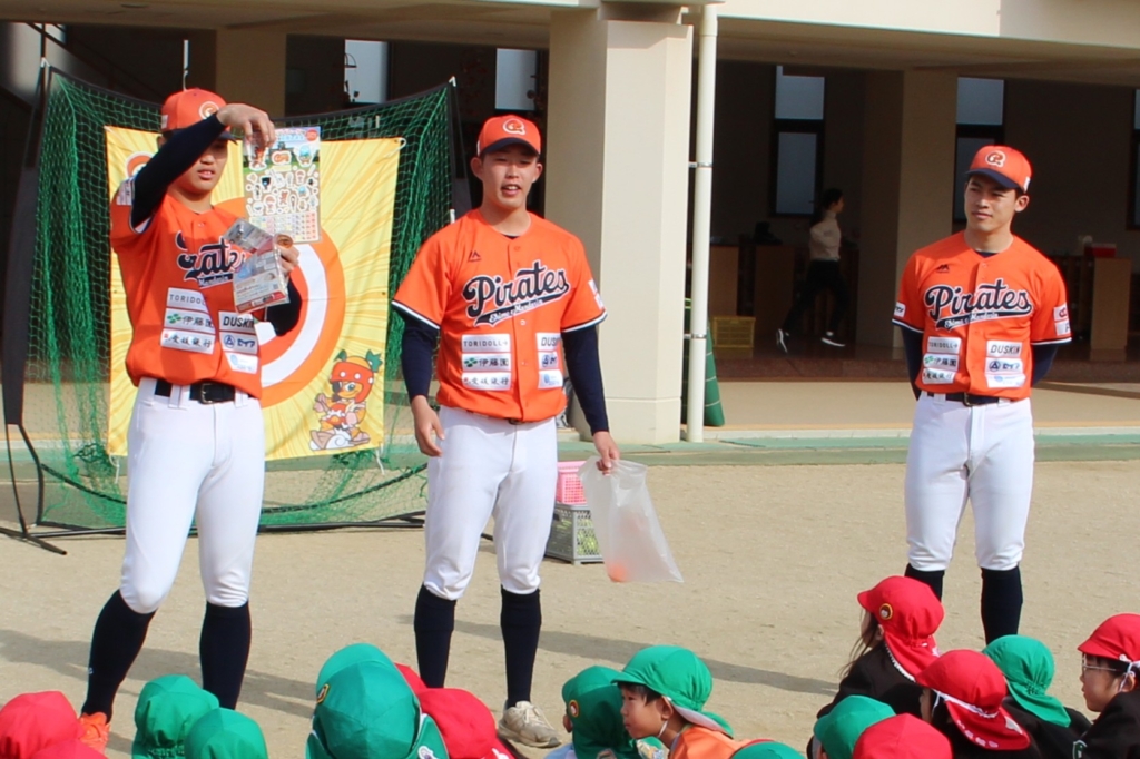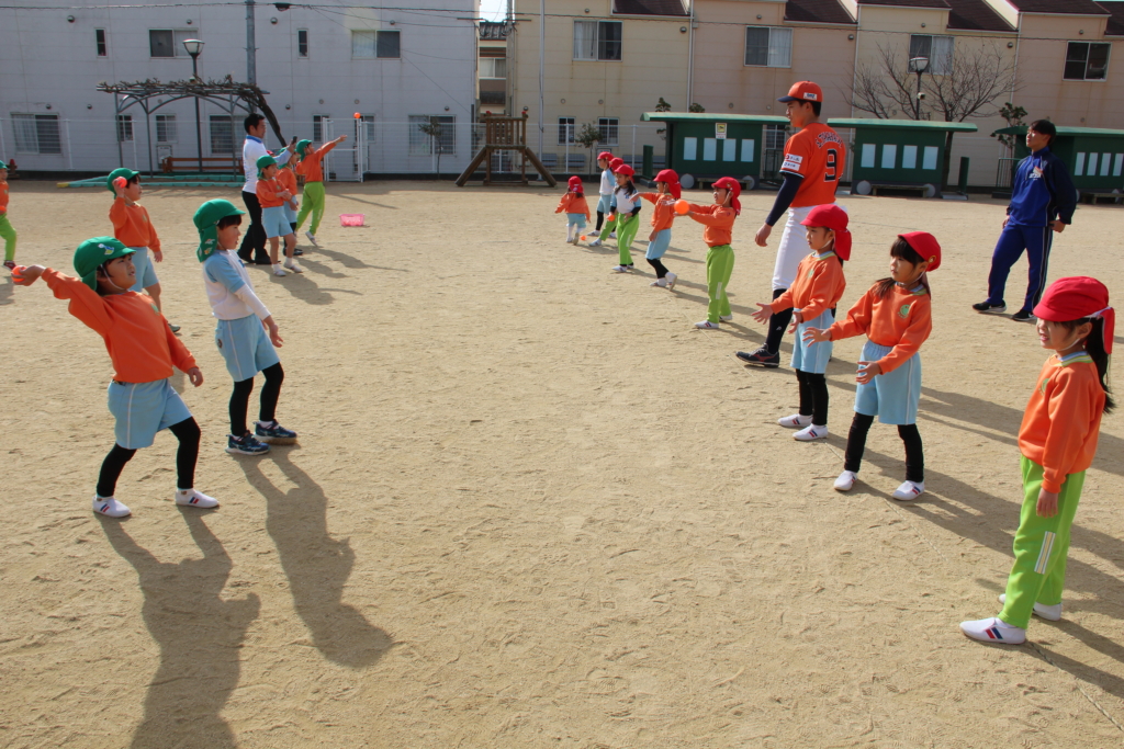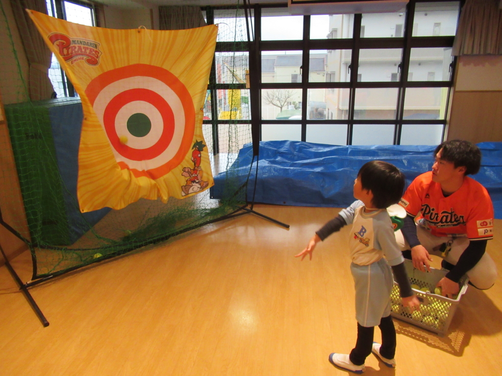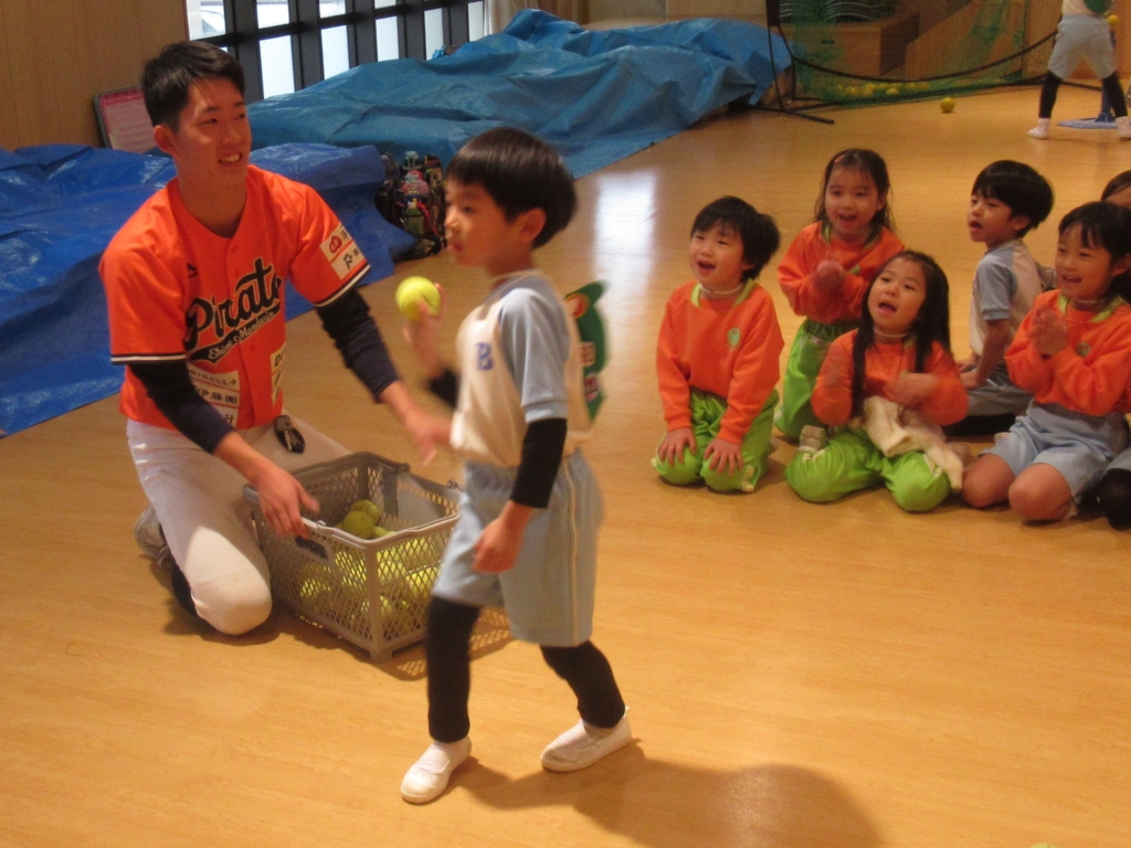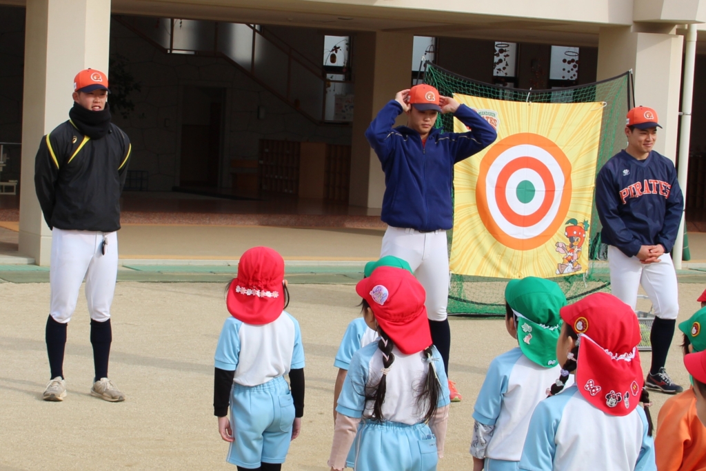 1月13日、15日に、愛媛マンダリンパイレーツの選手が来て、野球教室を開いてくださいました。