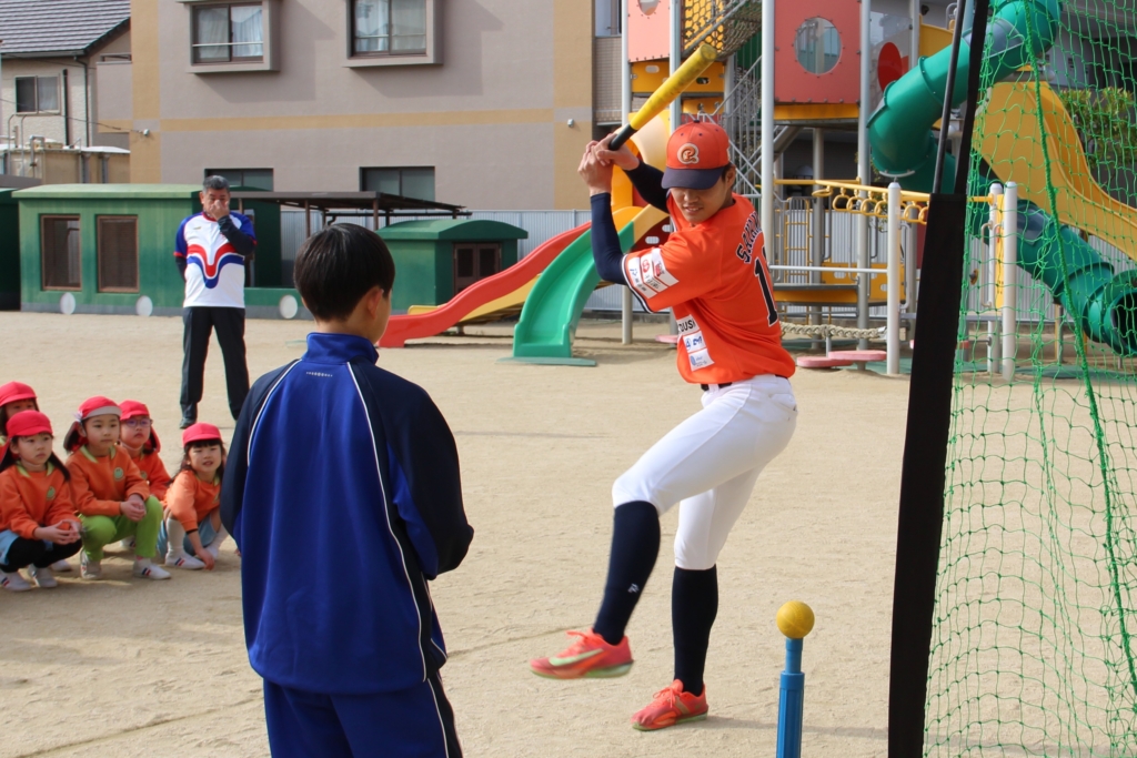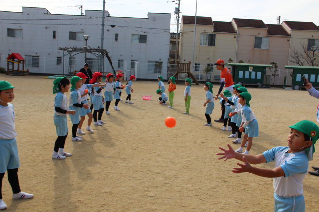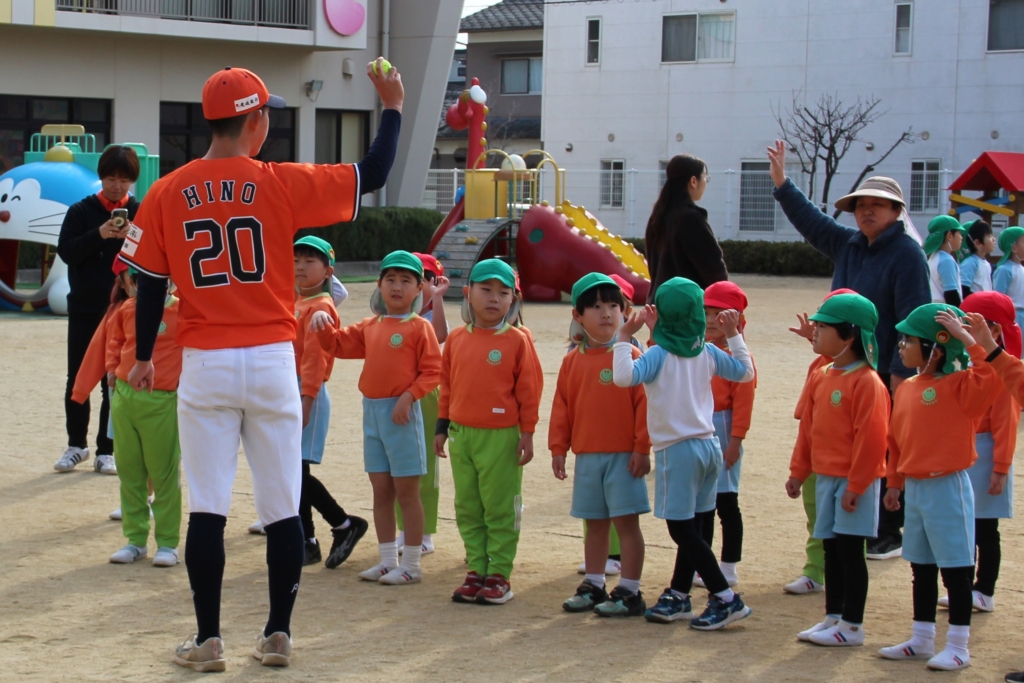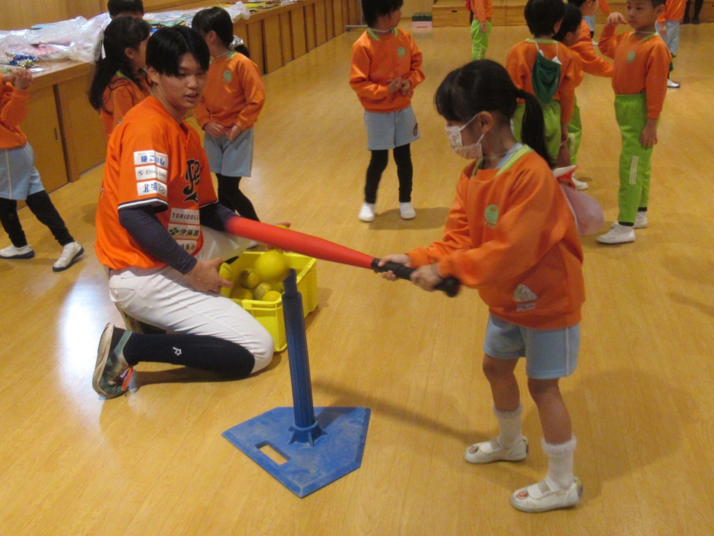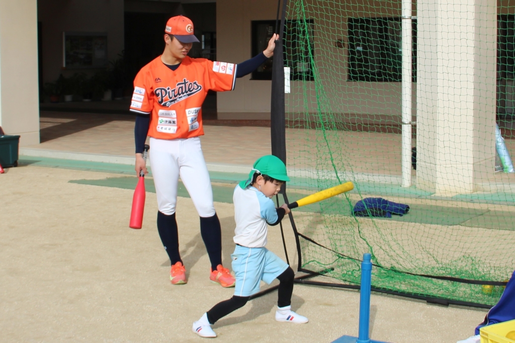 1月13日、15日に、愛媛マンダリンパイレーツの選手が来て、野球教室を開いてくださいました。