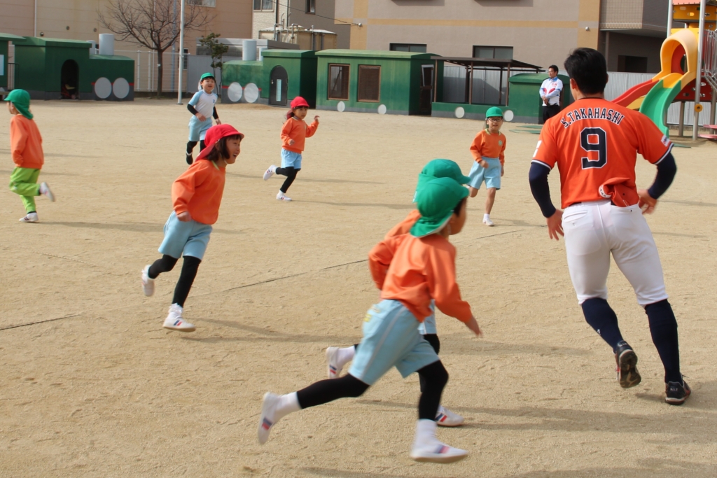 選手のおしりのポケットに入った帽子を取ろうと、全員で追いかけます。さすがスポーツ選手!子どもたちはなかなか取ることができません。