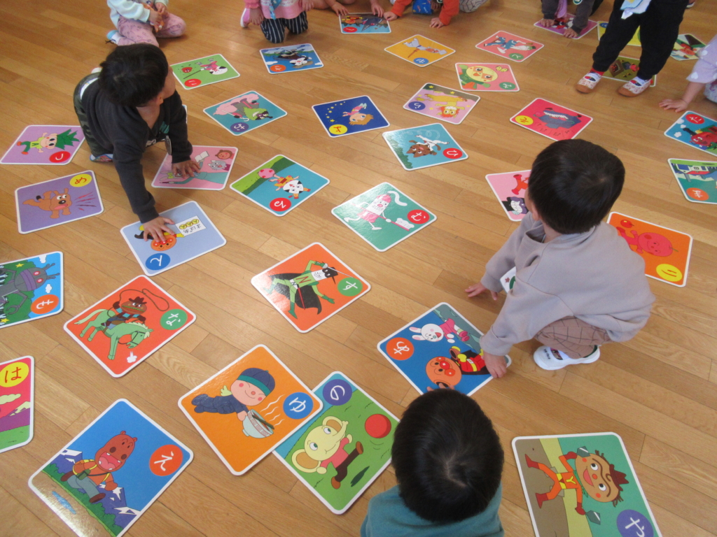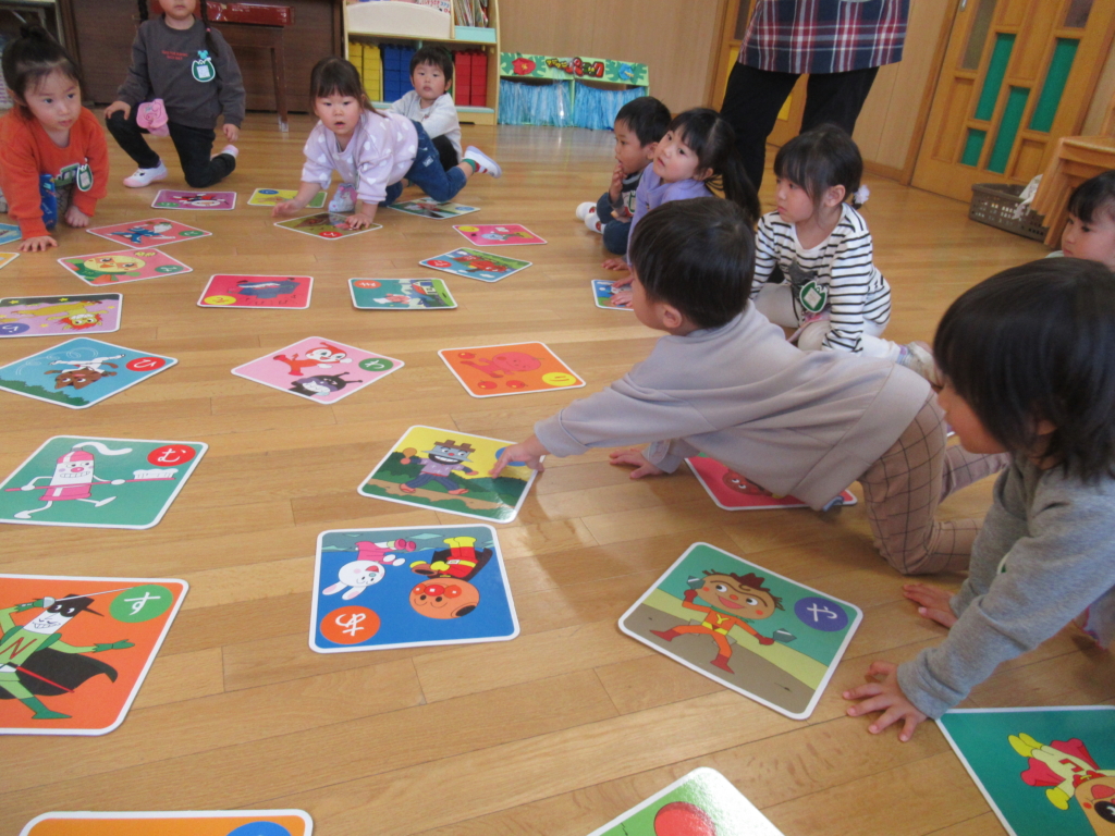 アンパンマンのかるたなので、キャラクターの名前を聞いて、絵で取り札を探しています。