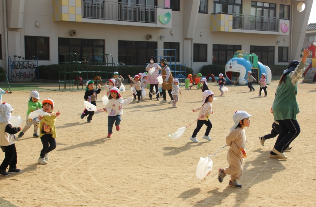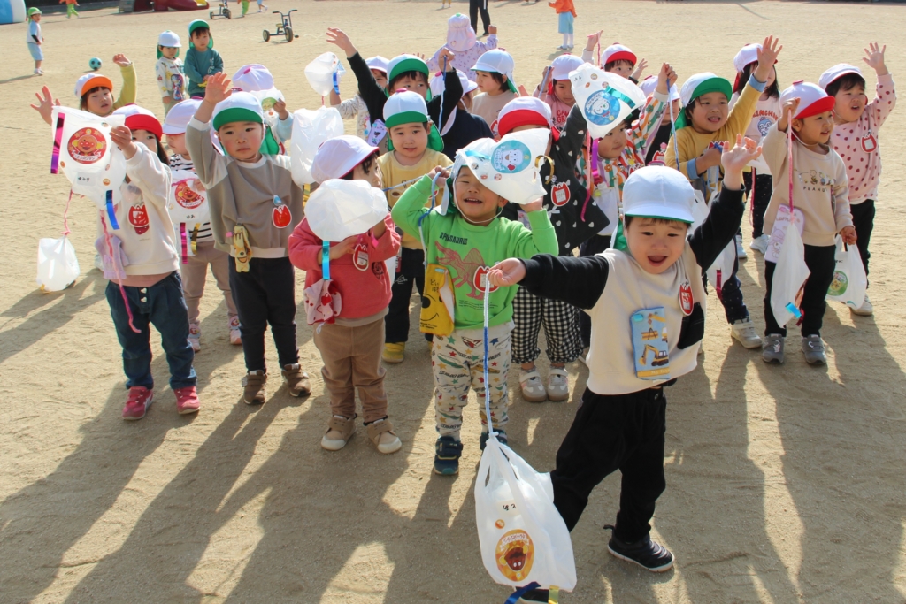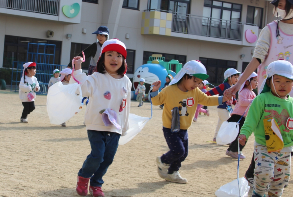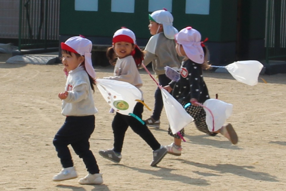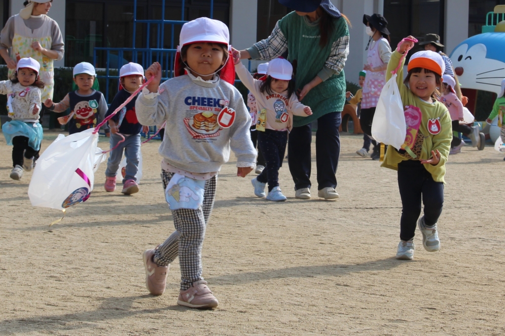 いちご組のお友だちは、手作りのナイロン袋凧を、元気いっぱい走って、揚げて(引っ張って?)います。