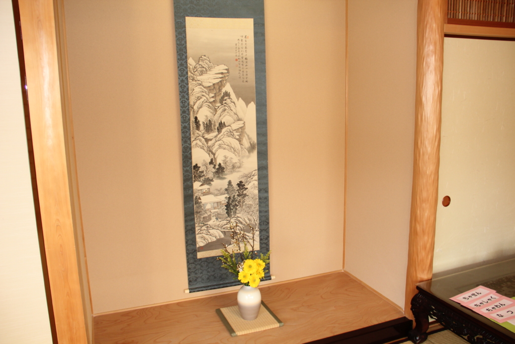 床の間に掛け軸がかかり、お花が生けてある落ち着きのある和室で行います。