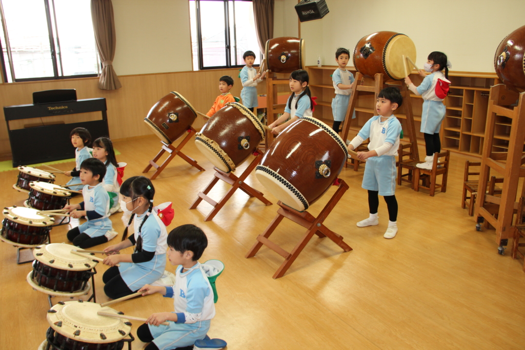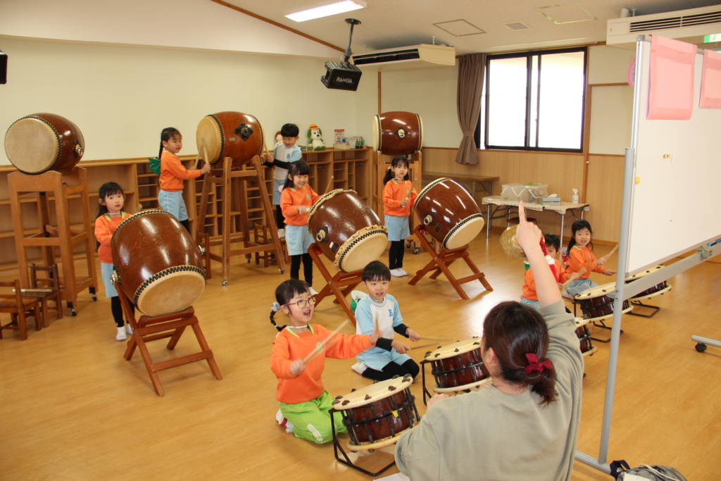 そして、年長組さんは、最後の参観日に向けて、和太鼓の練習をがんばっていました。