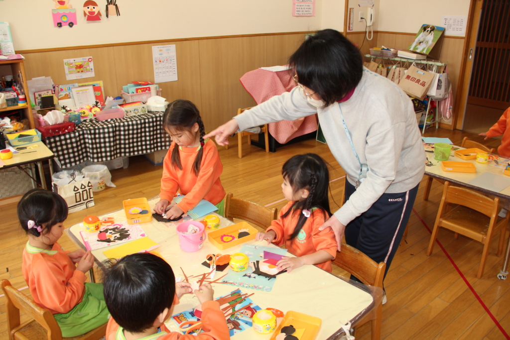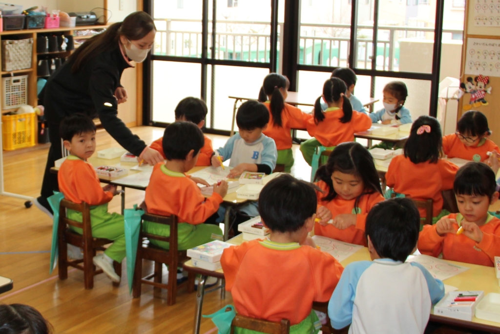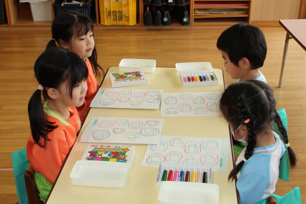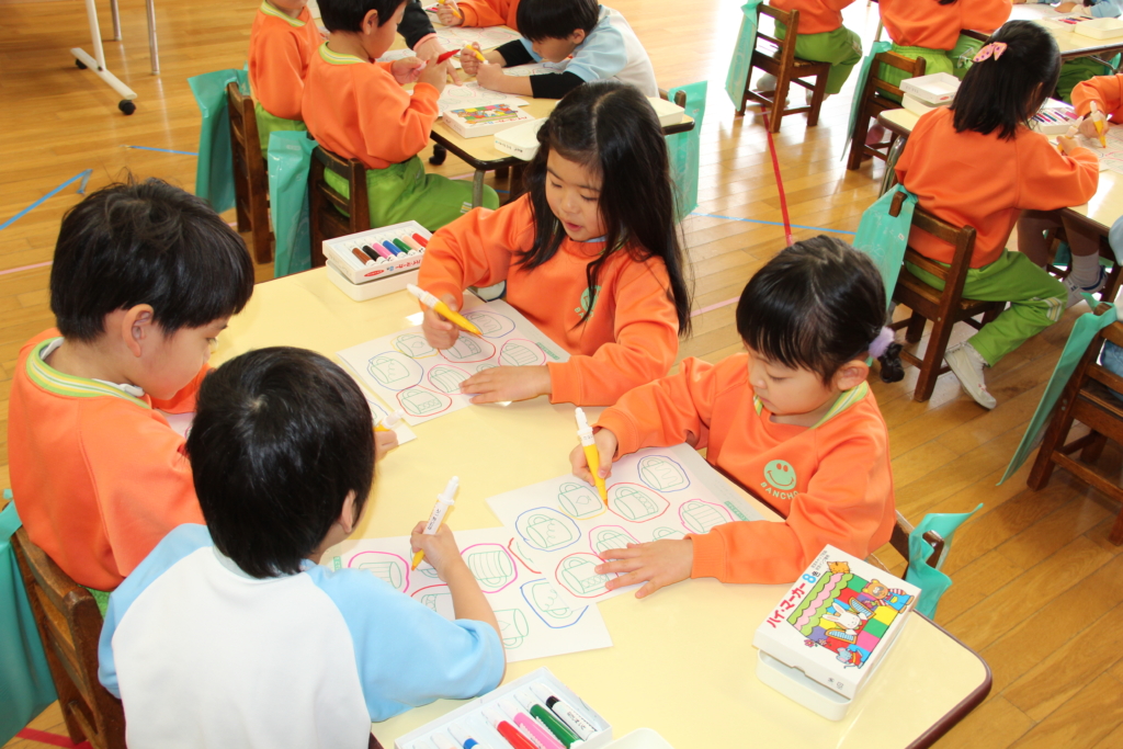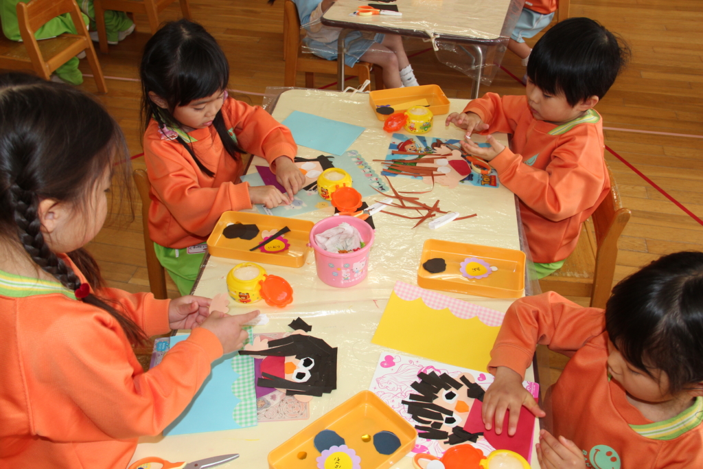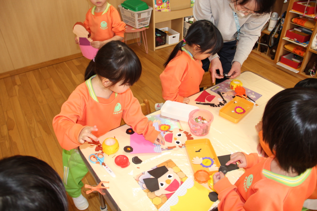 体育館で練習が行われているとき、お部屋に行ってみると、お遊戯会のことが気になる時期でも、「ちえのみあそび」や製作活動をがんばっていました。