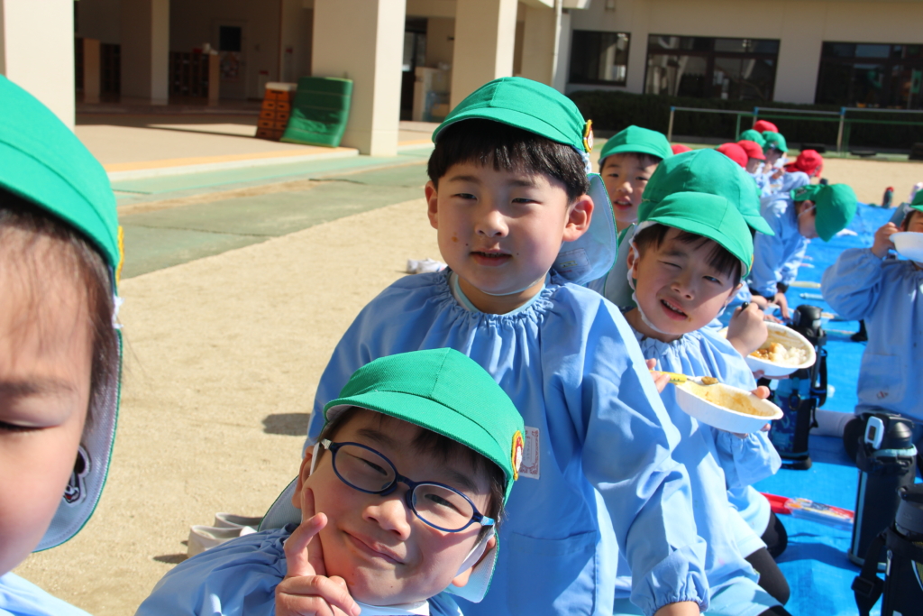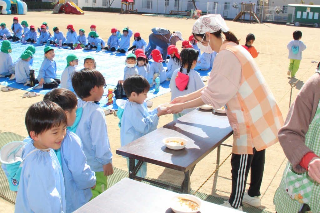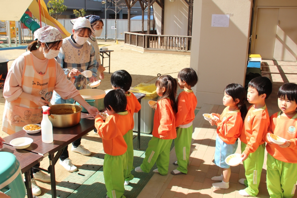 18日も運動場で行う予定でしたが、林野火災に関する注意報が出たため、調理は室内で行い、食事の配給と食べることは運動場で行いました。