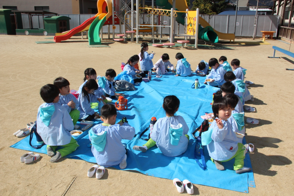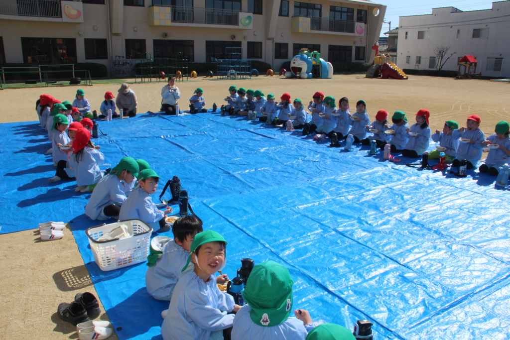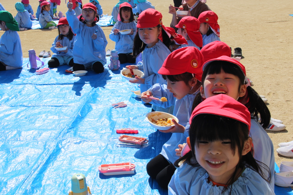 運動場に敷いたブルーシートの上で、みんなで一緒に食べます。