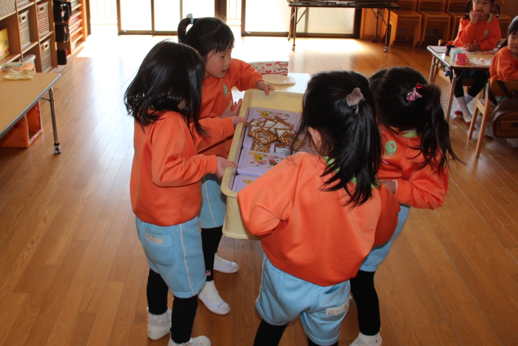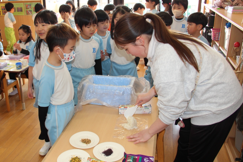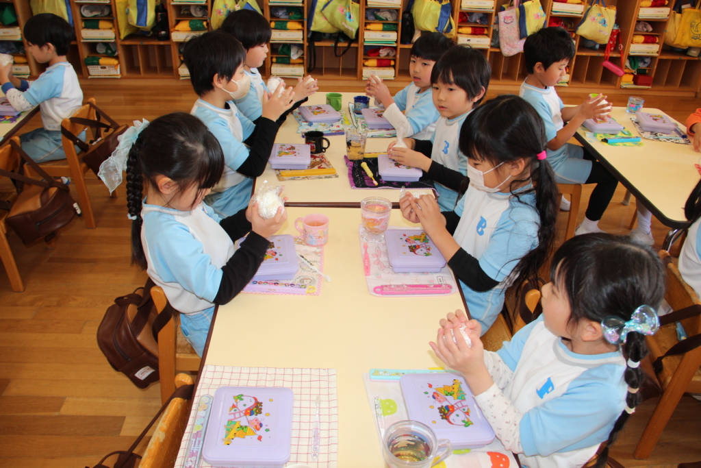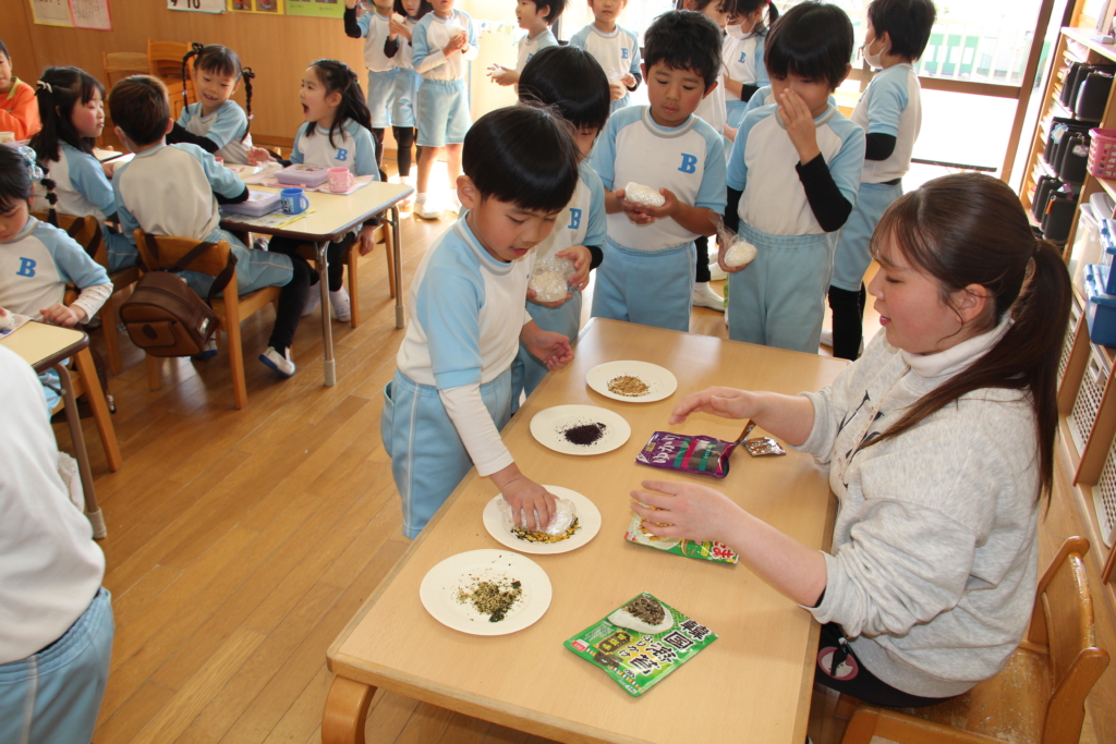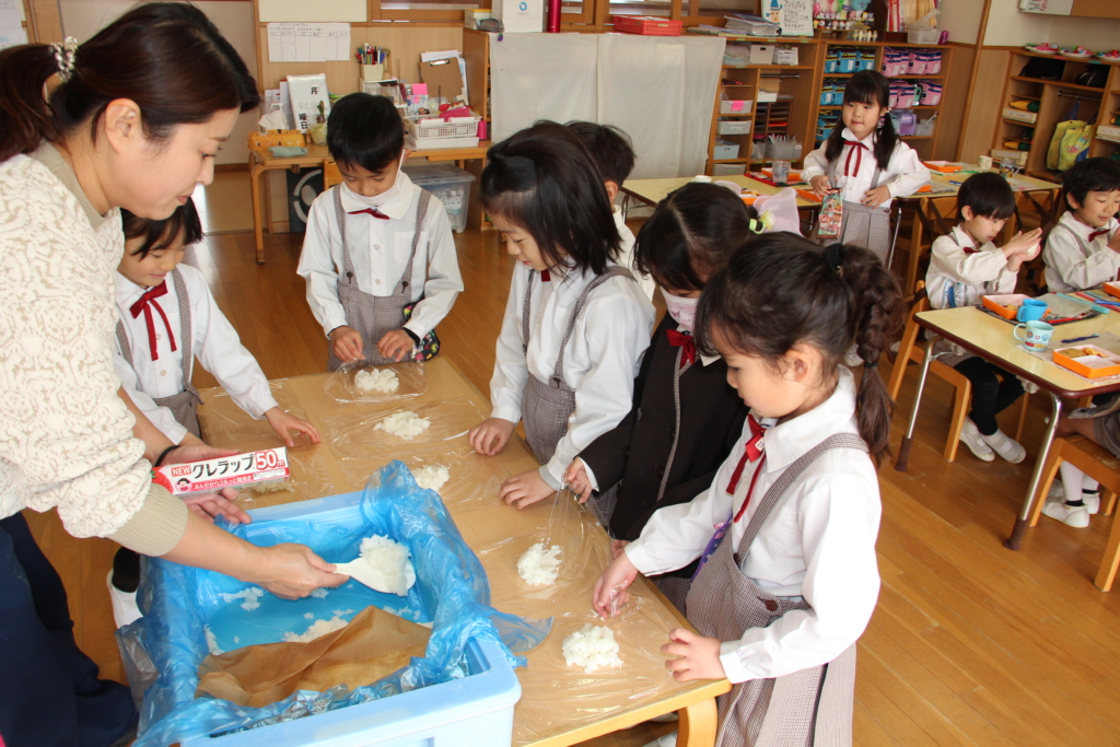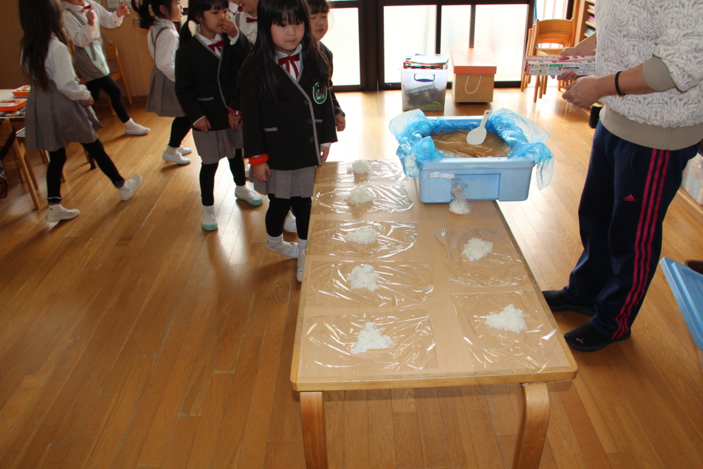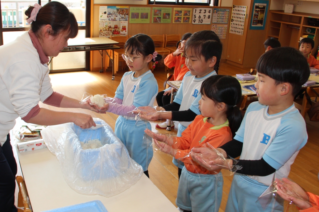 2月19日にもも・さくら・つばき組が、20日にうめ・もみじ組が、それぞれおにぎりパーティーを開きました😊