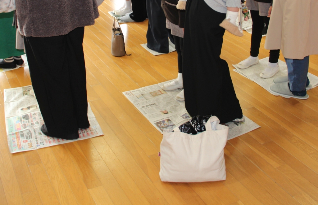 新聞紙の上にのって、〇×クイズ! 間違うと新聞が折られてどんどん小さくなります。