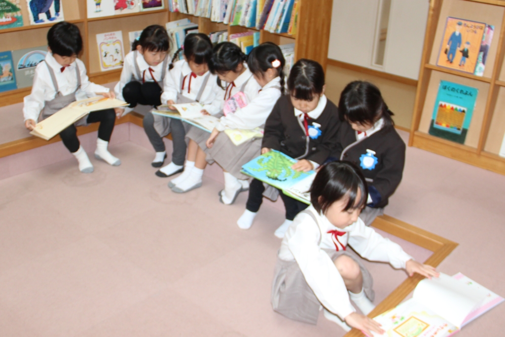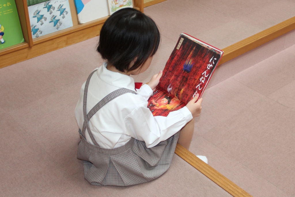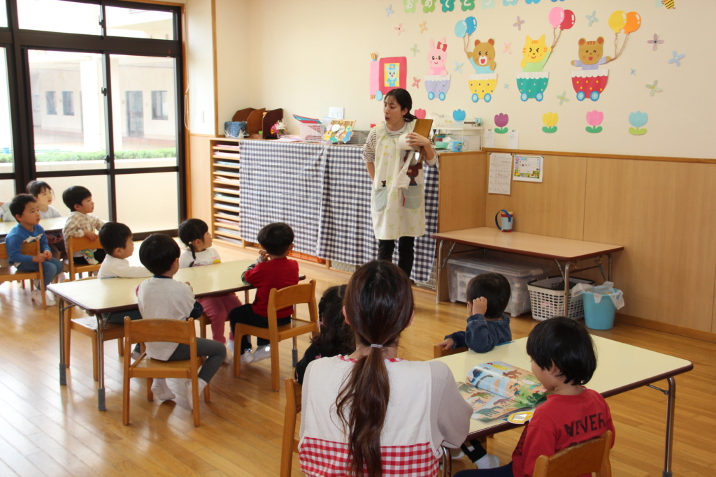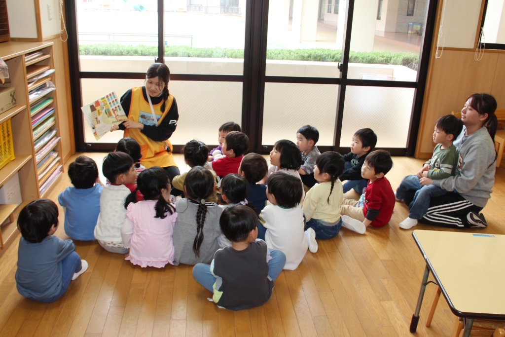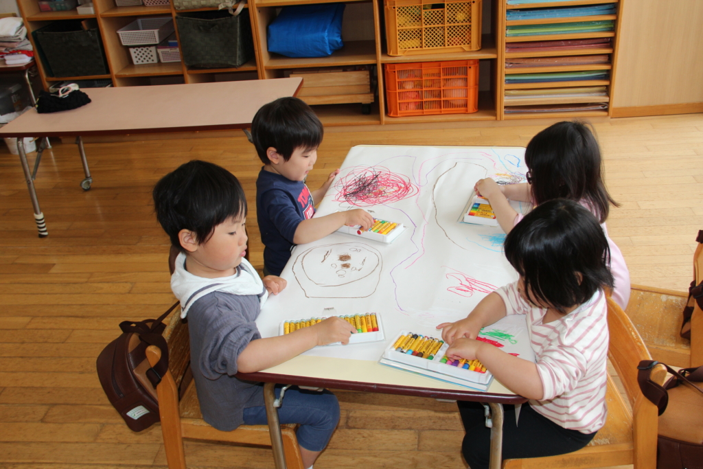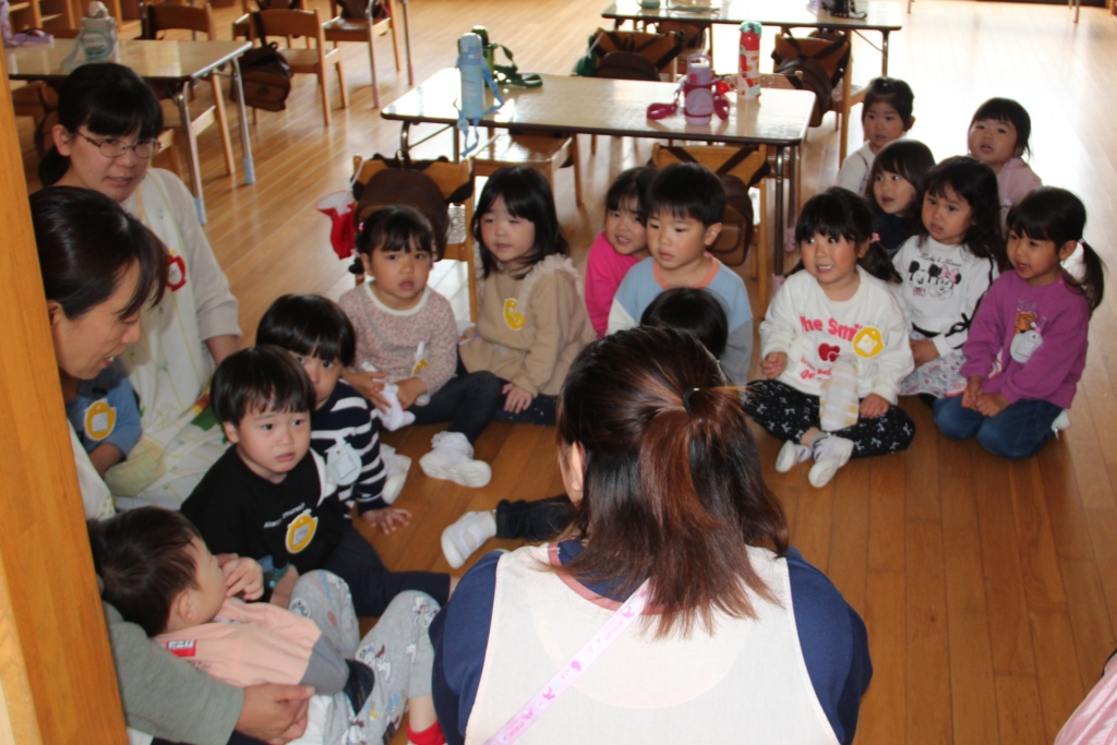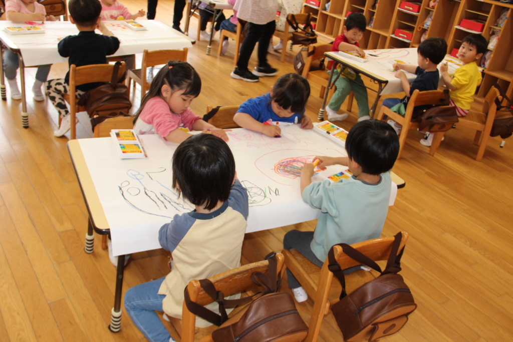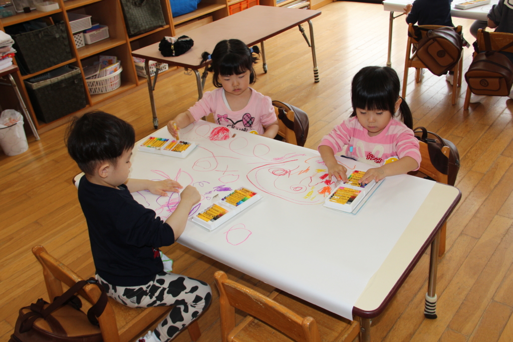 遊んだ後は、幼稚園での生活の仕方を教えてもらったり、みんなでクレヨンの使い方を練習したり、読み聞かせをしてもらったり、お部屋全体で学ぶ活動をしていました。