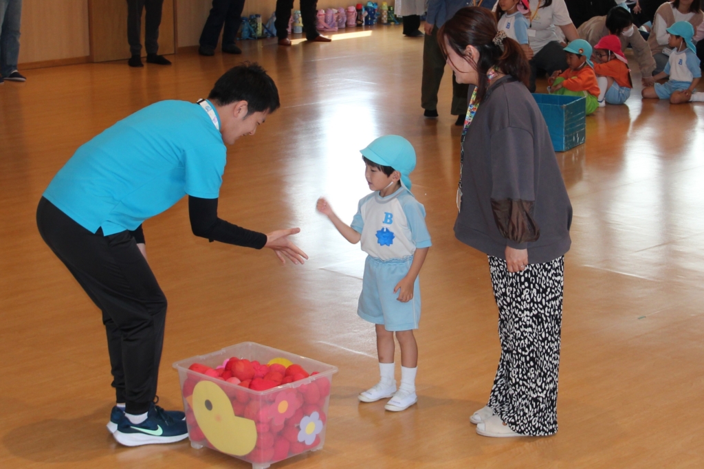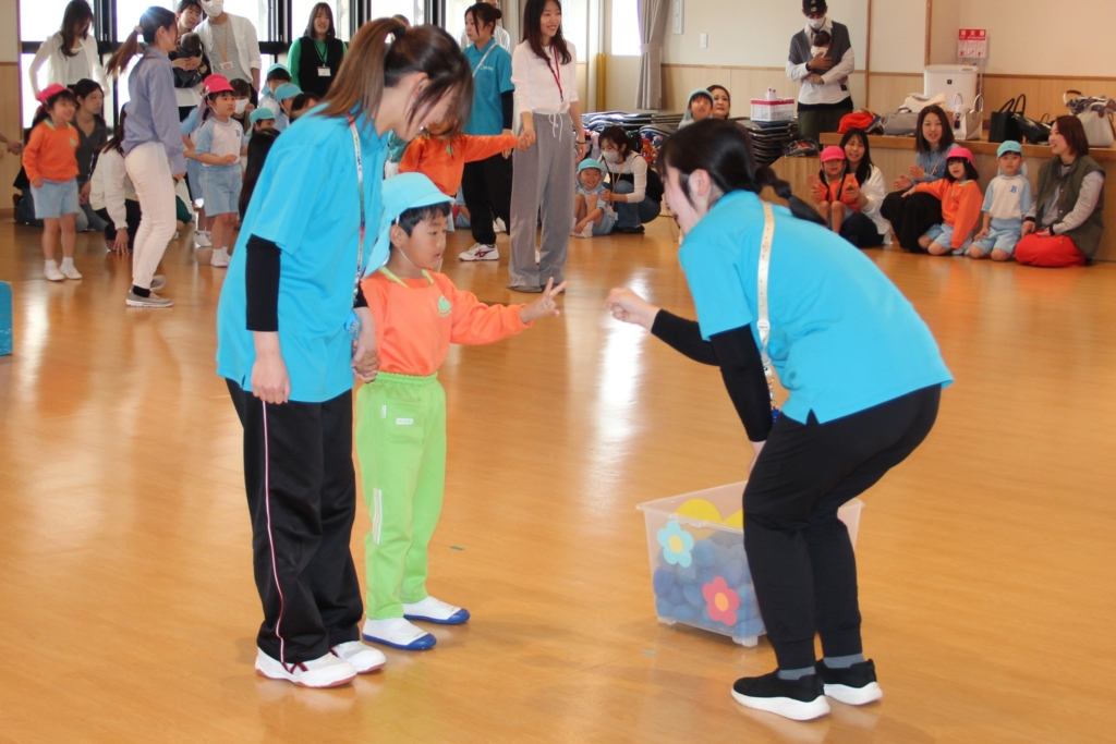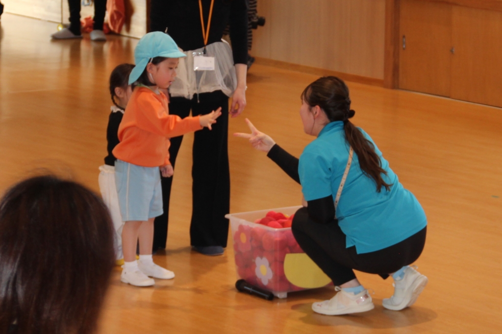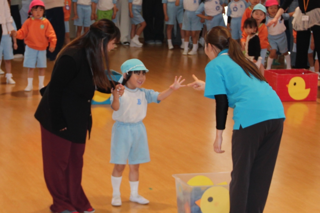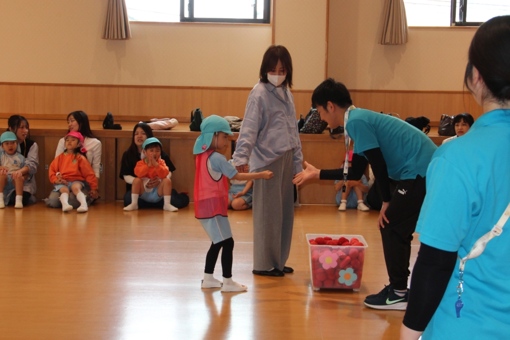 担任の先生とじゃんけんをして、勝ったら玉を1個ゲットできます。それを、お部屋のお友だち全員でリレーして、何個玉を集められるかを競うゲームです。