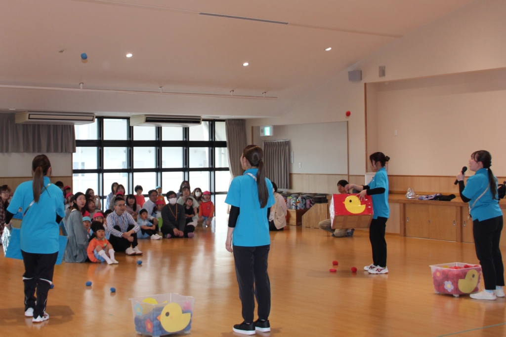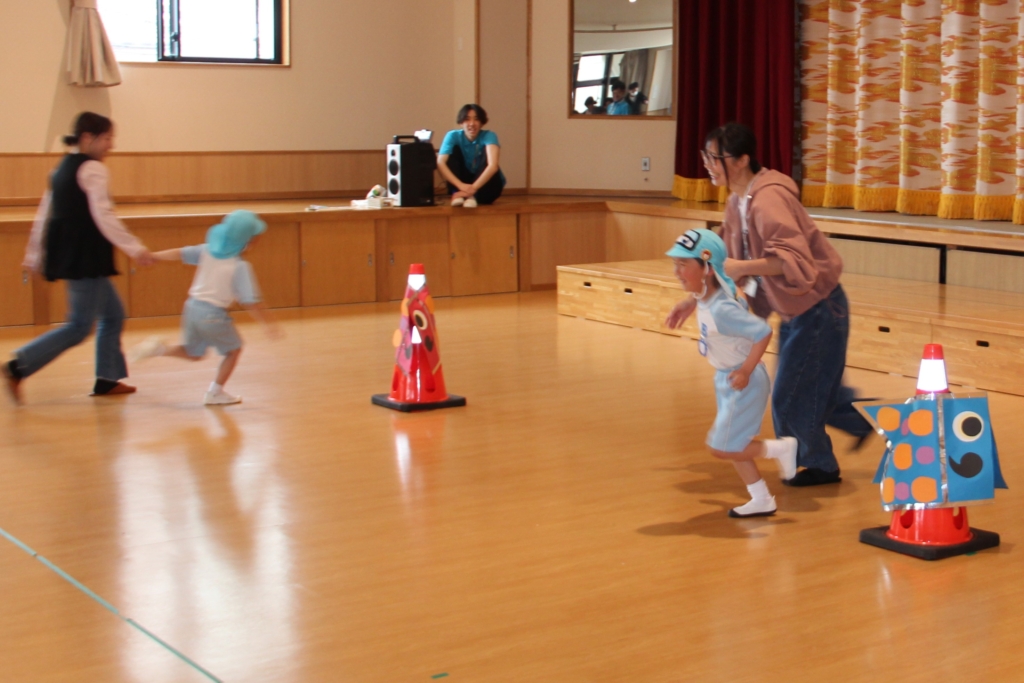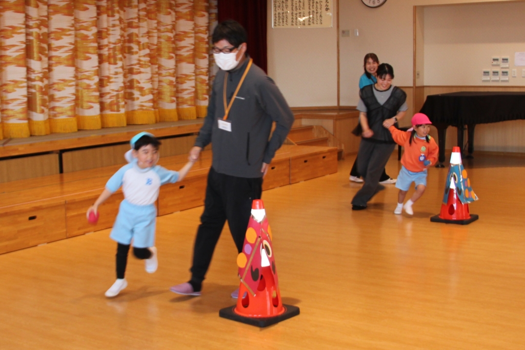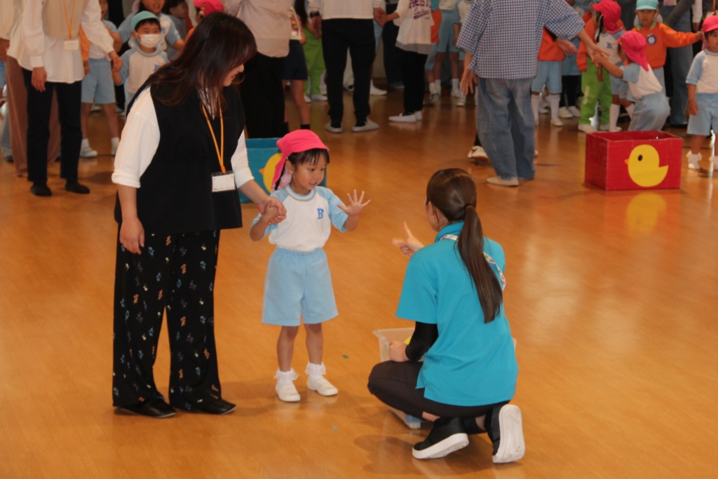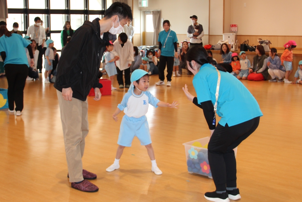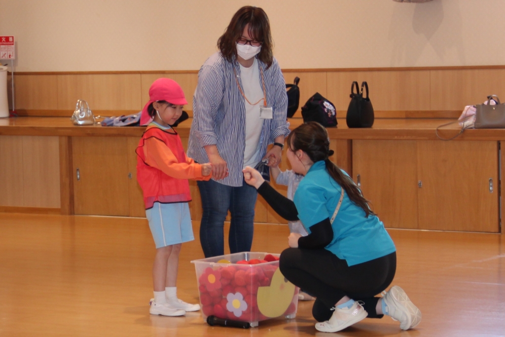 担任の先生とじゃんけんをして、勝ったら玉を1個ゲットできます。それを、お部屋のお友だち全員でリレーして、何個玉を集められるかを競うゲームです。