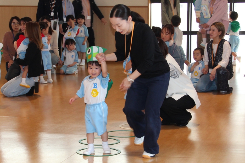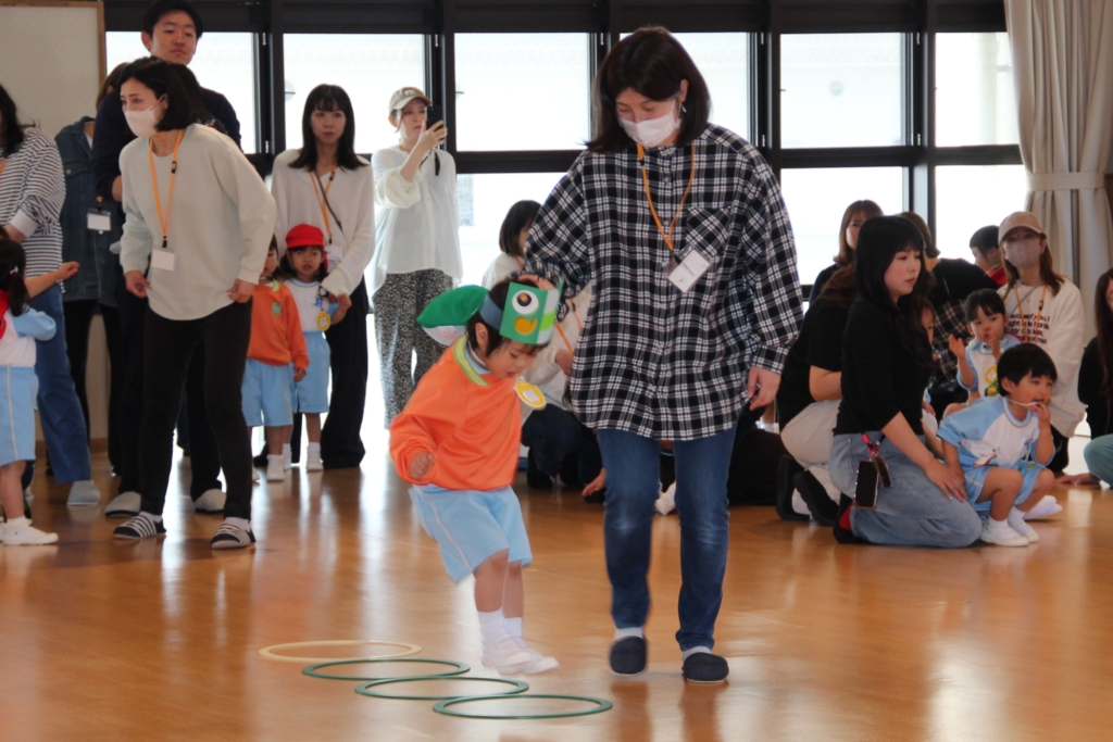 おうちの方と手をつないで、フラフープの中を両足ジャンプ!